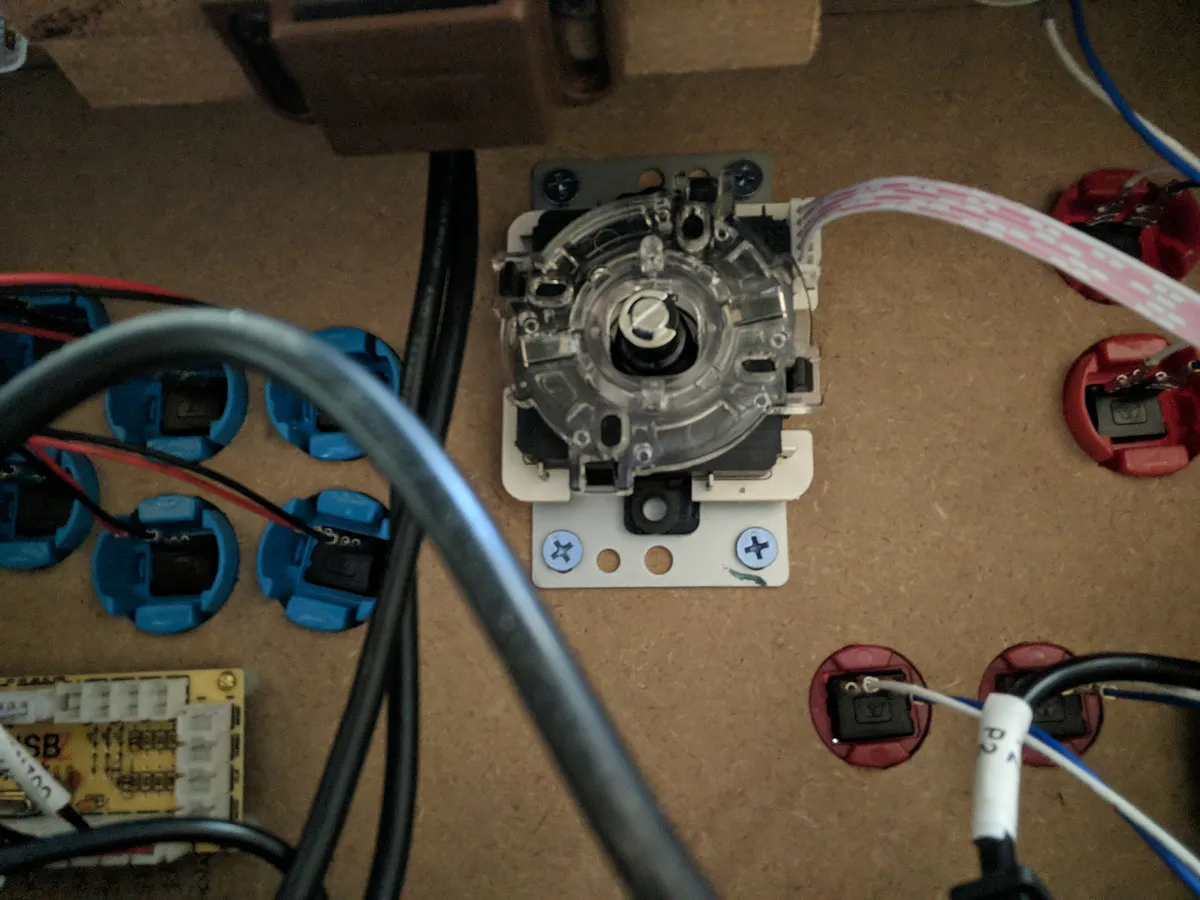 Sandwich the wood button piece, the overlay printout and the button plexi. Then insert the buttons to hold the pieces together. I also attached the joysticks to the wood piece from the bottom using #8 x 3/8" screws.