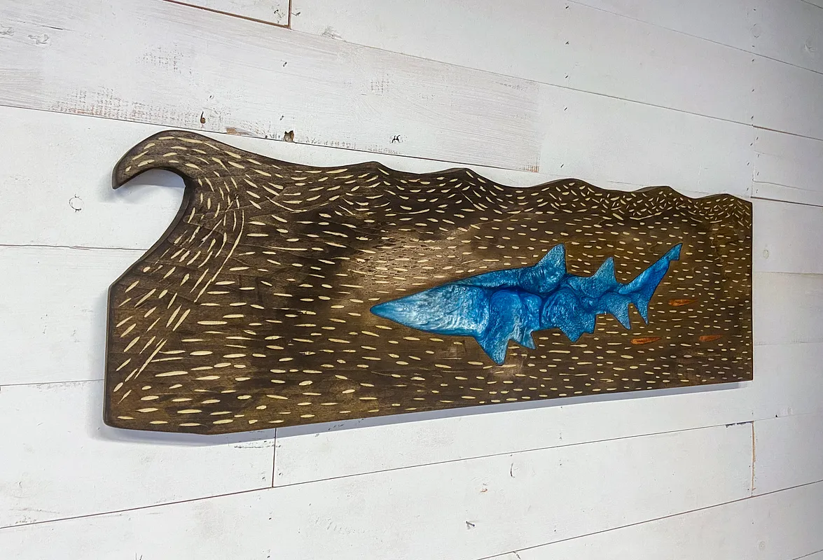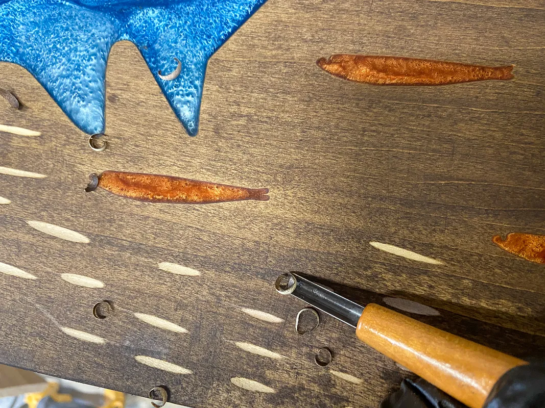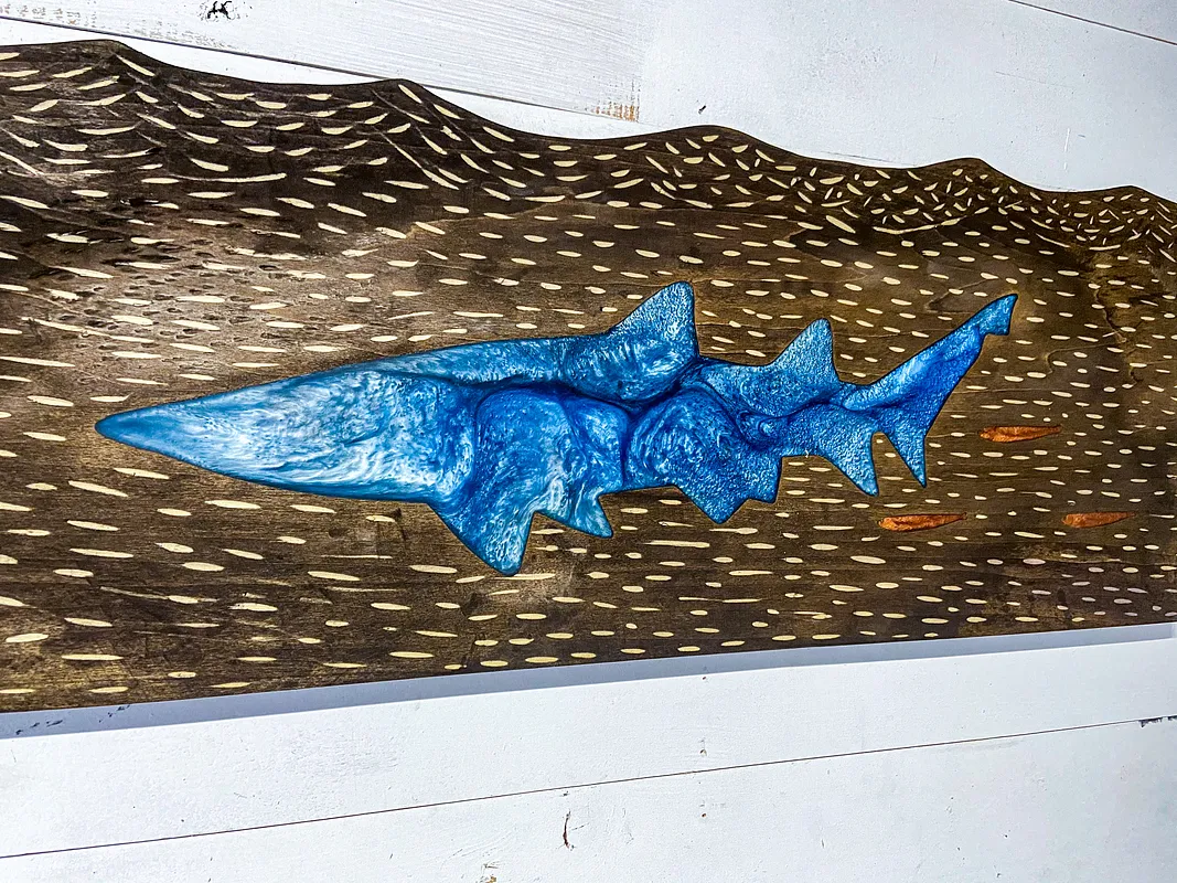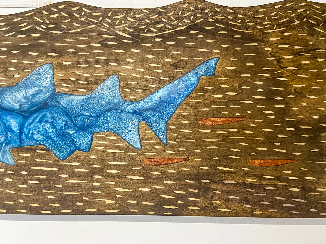 I went with a dark walnut stain to help the blue shark pop off and let the feeder fish blend into the background.
