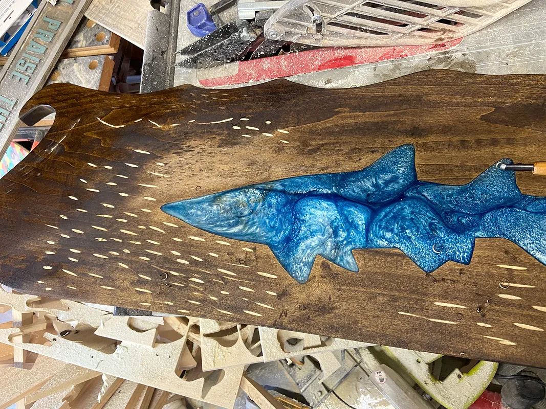 Side Note Tip: I used a hot glue gun and pour a bead of glue all around the edge of the shark and fish. This will keep the resin from pouring out all over the board. Once resin is harden you can scrape off the glue.