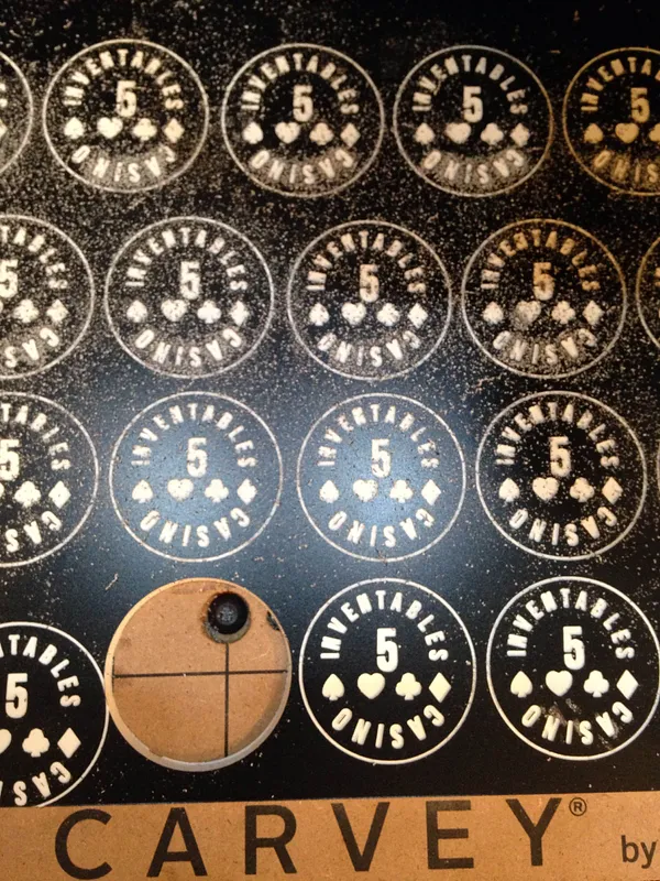 Easel now has 2 steps so you can cut with 2 different bits. Another option is to design the circles with the letters in one workpiece (at the bottom), duplicate it and on one erase the letters on the other the circles. Make sure you carve the letters first, then cut the circles.