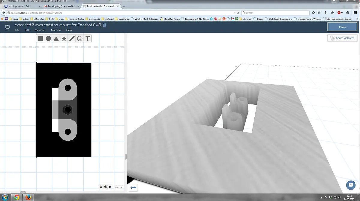 I don't own the x-carve machine. I have a 3D Printer and I'm very interest in all kind off this stuff. I tried out the Easel software to know what is possible with it. That's what I made: All software I uesed is free. -I drawed this workpiece in Sketchup. (Usually I would than 3D print it.) -I had to add a floor plain. -Exported a topview of it as pdf. (Perspective off) -Open the PDF in Inkscape and safe it as SVG -Import the SVG to EASEL -Set the depth for each plain like I draw it in Sketchup.