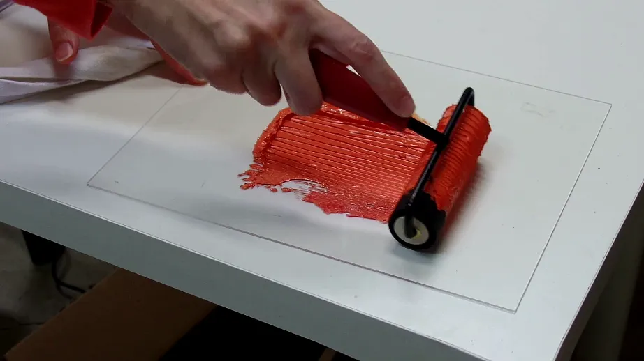 For each block, you'll want to thoroughly ink the image. Using a hard rubber brayer/roller, and a flat, washable surface, put a bit of the ink down and roll it until the brayer is evenly covered with ink. Then roll in all directions on your block, making sure your entire image is well covered in the color you want to use. For the pumpkin, we use orange. Face, black. Stem, green.