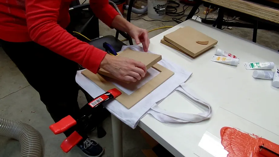 Also, all the blocks should be the same size, with the part being printed on each block being in the right relative position. That way, with a simple positioning template clamped onto the canvas bag, you can print each block in exactly the same spot.