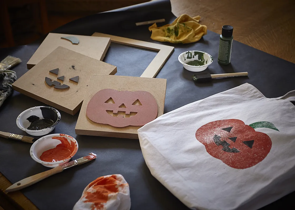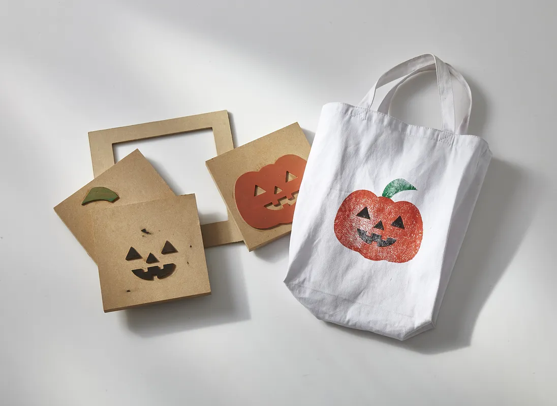 For this step, for the trick or treat bag just cut out the pumpkin background, the face, and the step each separately from 3/4" MDF, and then a positioning template from 1/4" MDF. The blocks are all exactly 7" square. Seal each block with shellac or something similar. Otherwise, the MDF will soak up your ink and your block printing will come out looking rough.