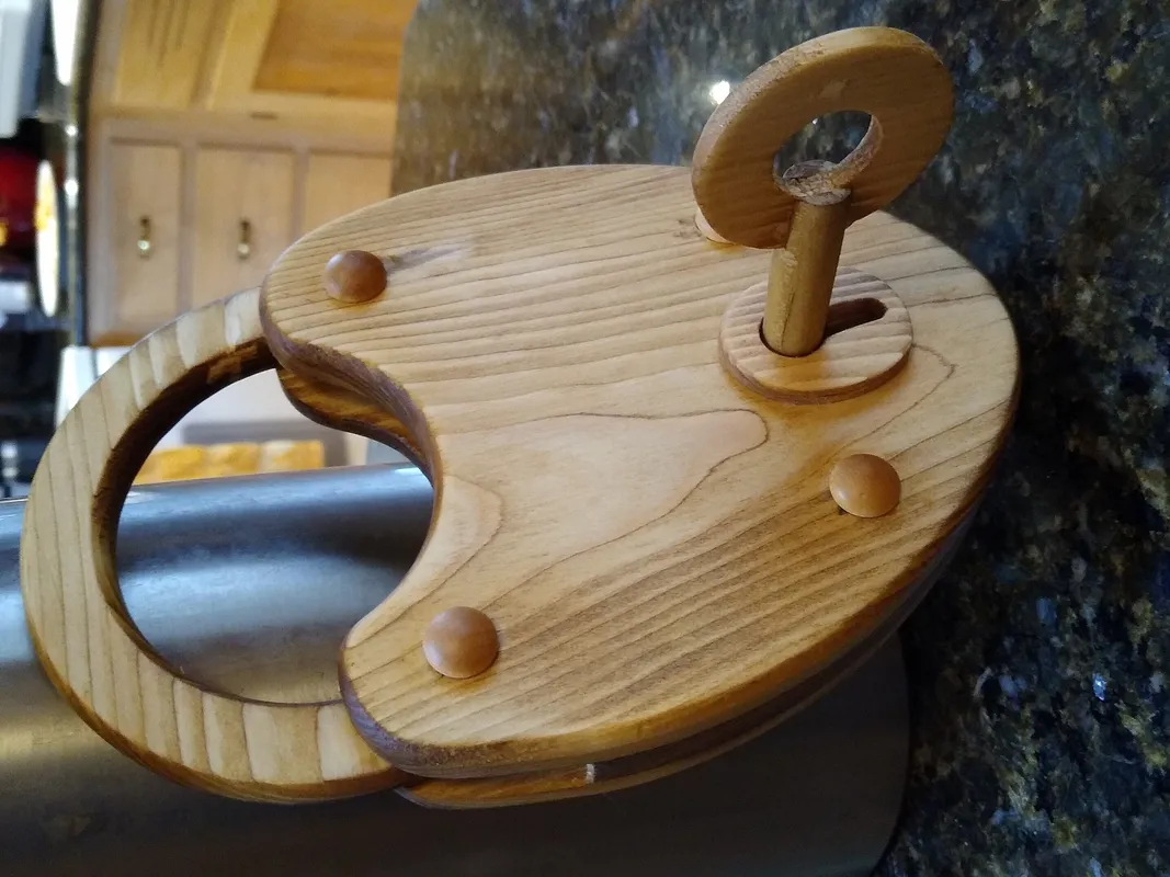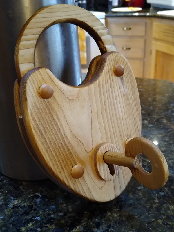 A working wooden lock and key. Plan inspired by "The Big Book of Wooden Locks: Complete Plans for Nine Working Wooden Locks" by Tim Detweiller. Key shaft and rivets were store bought. The rest cut by a Genmitsu 3018 ProVer.