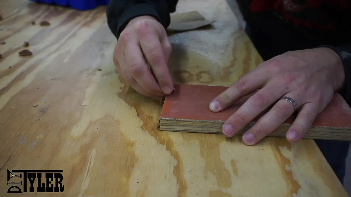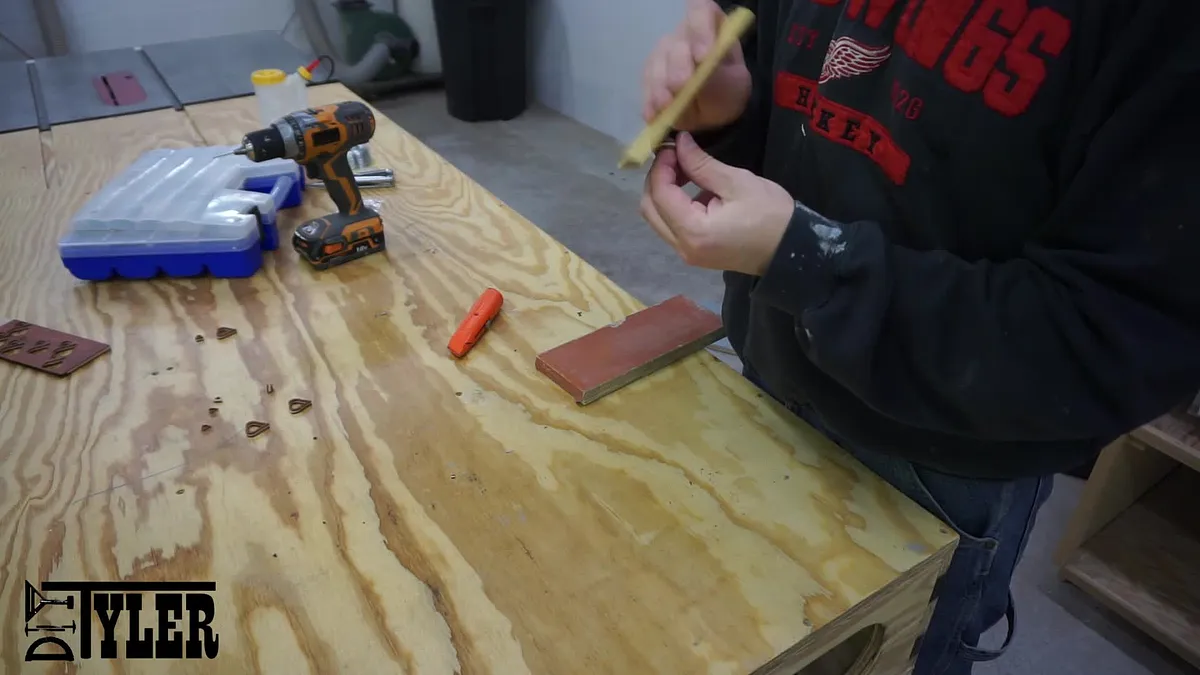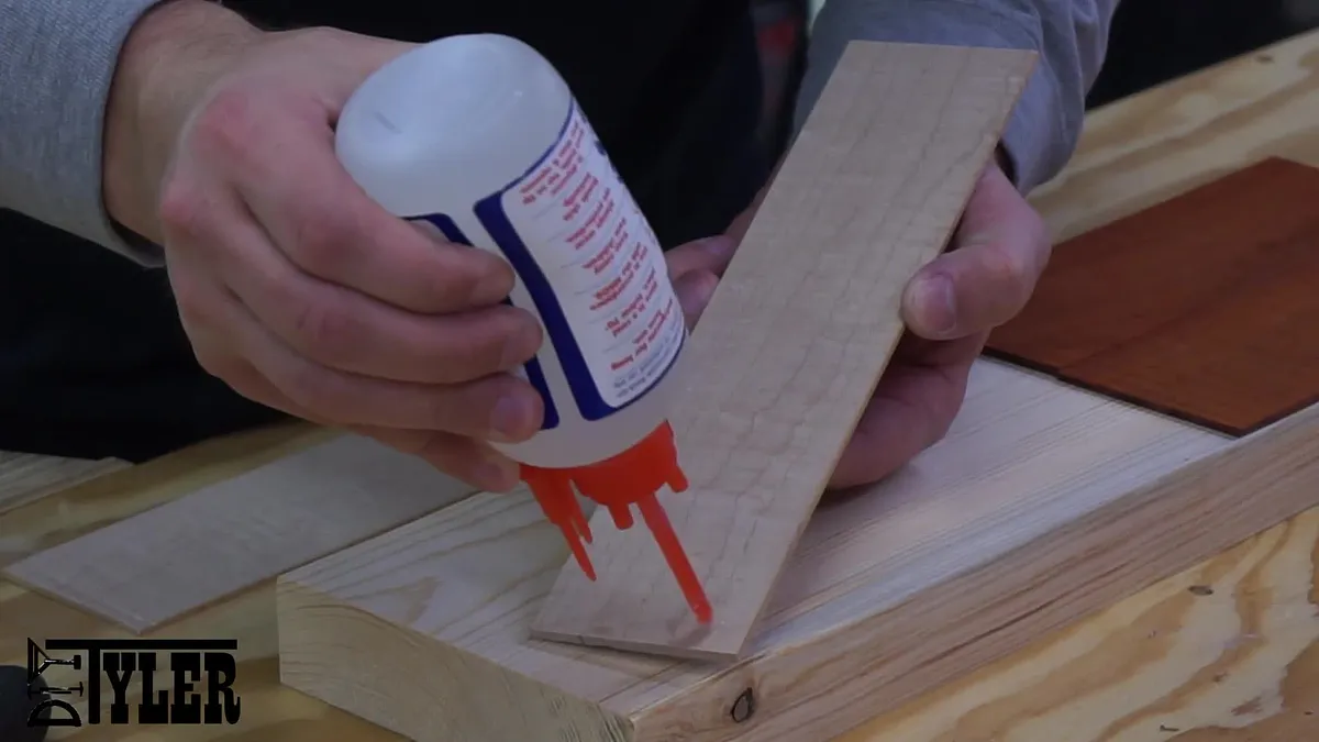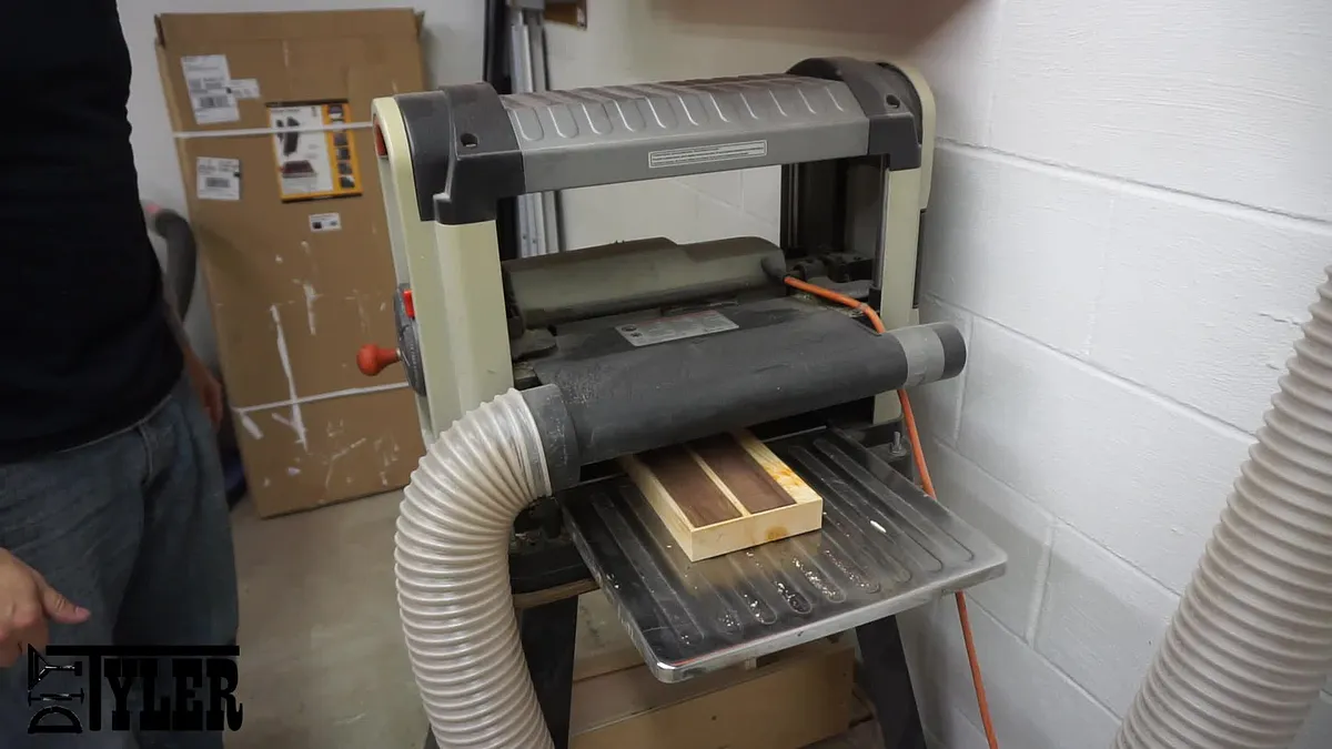 To safely plane this boards down to the 1/16" I used a few dabs of CA glue to adhere them to a squared piece of stock that I used as a planer sled. I then ran the sled through the planer until the boards were approximately 1/16".