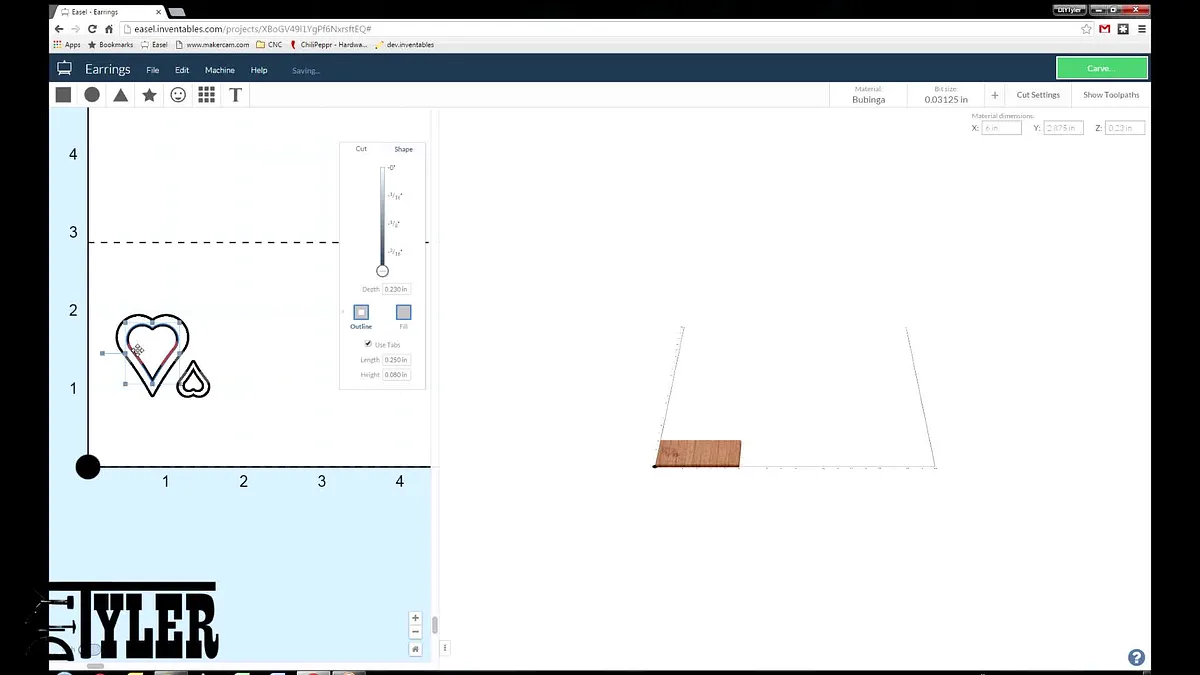 I have the privilege of having a CNC in my shop so I used that to cut the hearts out but I am sure a scroll saw would suffice. I designed the cutouts using sketchup, imported and adjusted using Easel and let the X-Carve go to town!