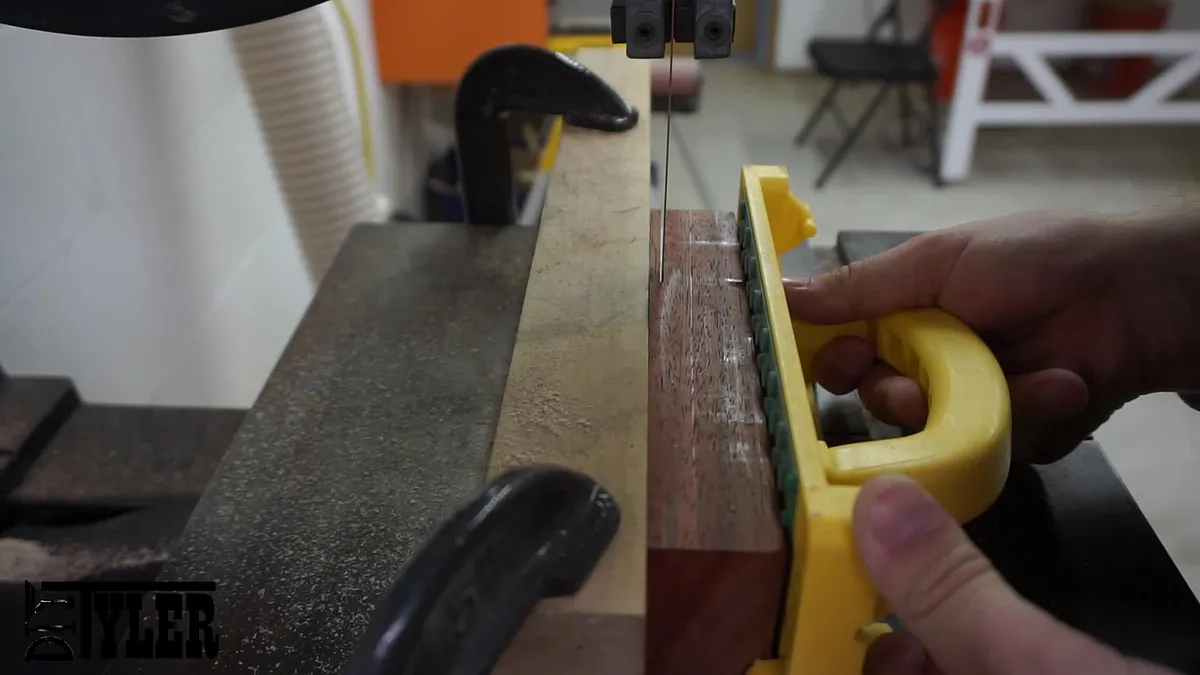 Obviously these earrings need to be as thin as possible and to get the laminated (Sandwitched) look I was after I needed the three pieces of stock to be about 1/16". To accomplish this I started off by resawing the stock to slightly less then 1/4". NOTE: I ran each piece over the jointer before resawing so I had one side already squared up, I ran this side of the stock against the bandsaw fence.