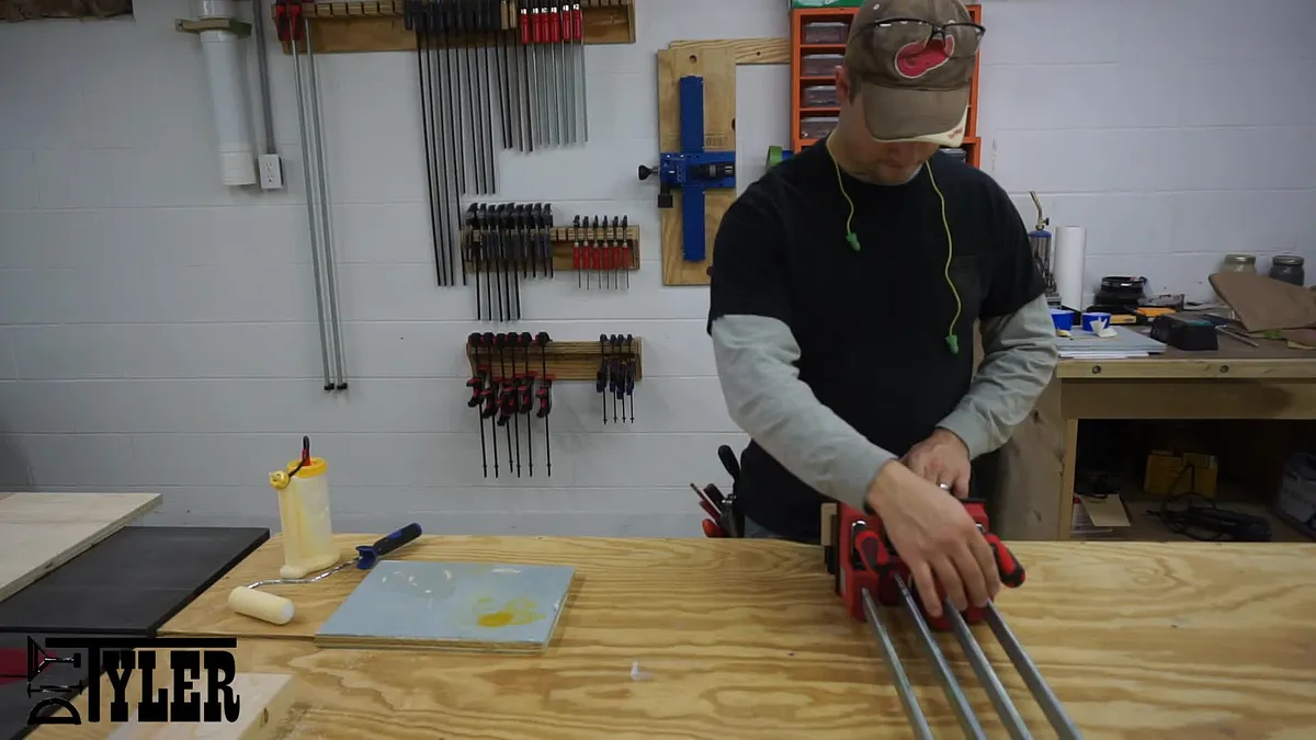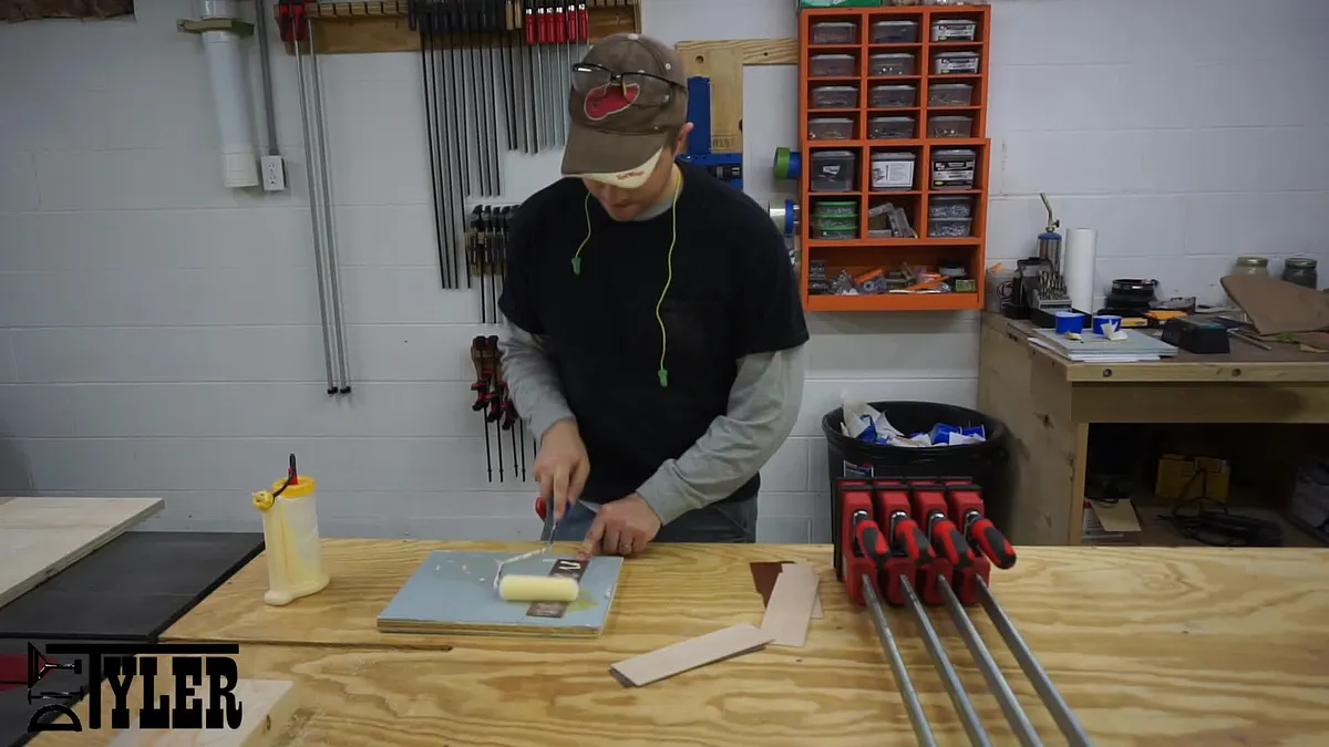 I used a foam paint roller to spread a thin layer of glue on the boards and layered them in the pattern I was after. I glued three laminations using these patterns; Padauk, Maple, Padauk: Maple, Padauk, Maple: Walnut, Maple, Walnut. I then clamped the three separate laminations in parallel clamps and let them dry overnight.