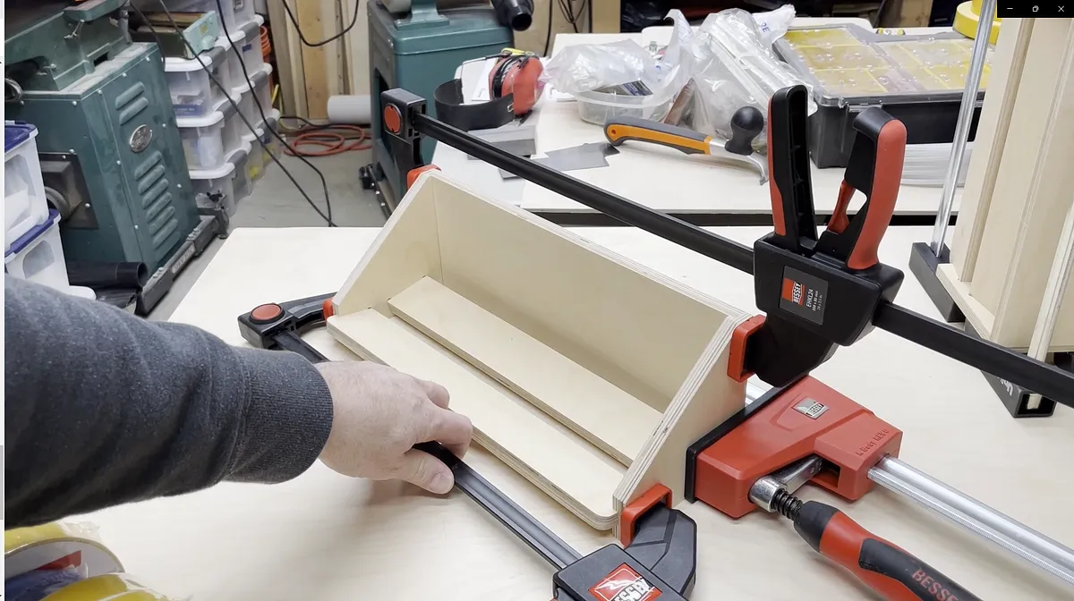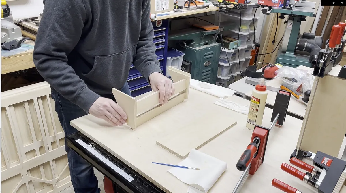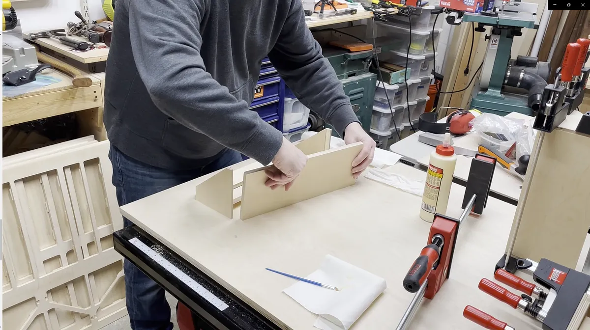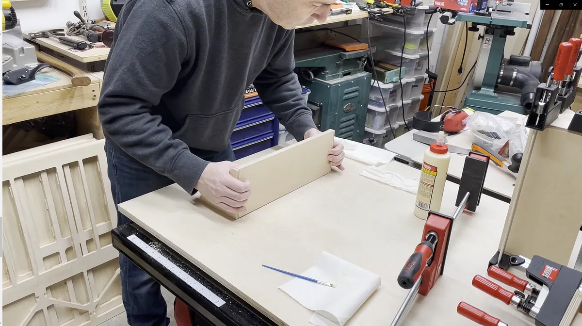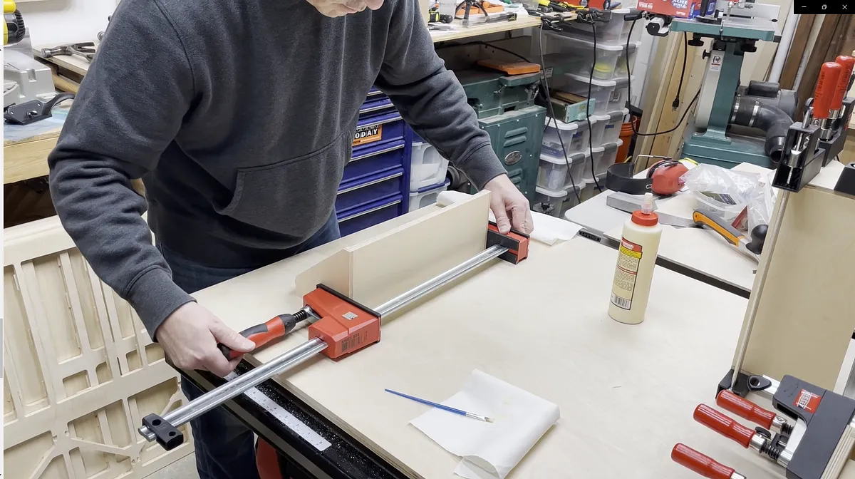 I then added the other side piece, but I didn't fully push the side in place. Instead I laid the assembly flat on my work bench and then added the back vertical piece for the shelf. With the vertical piece added between the rabbet areas you can now push the ends fully on and clamp in place. Make sure your reach vertical piece does not slip out from the rabbet areas. I had this happen on one of my glue ups.