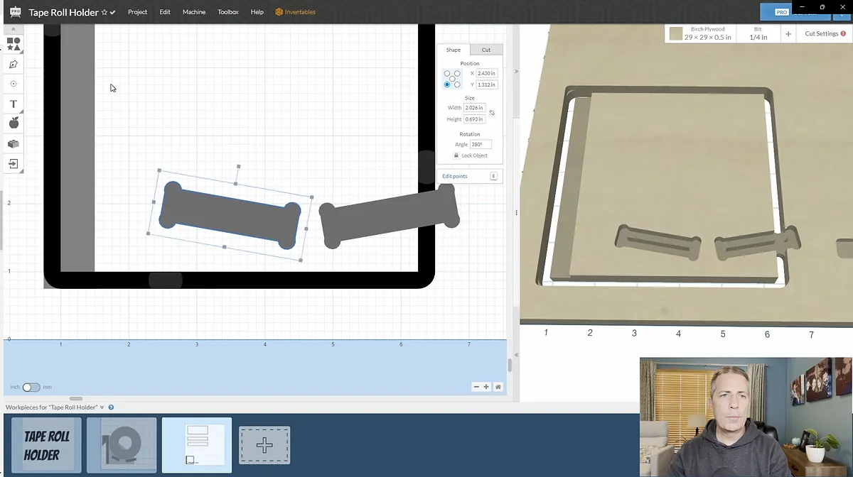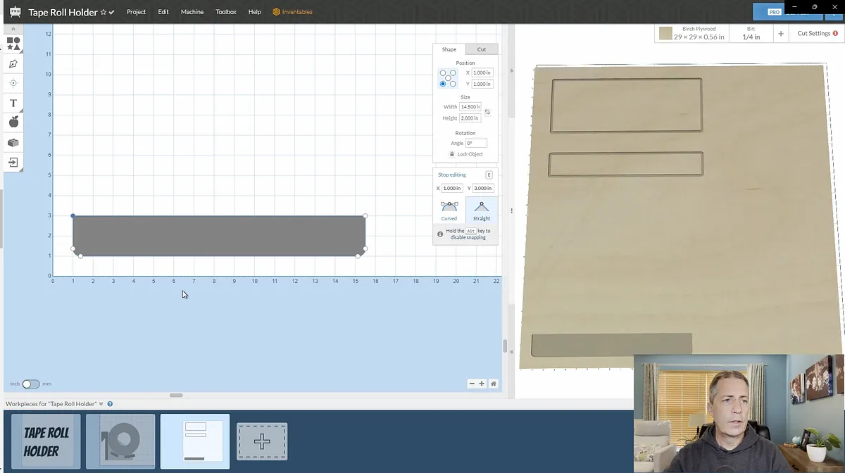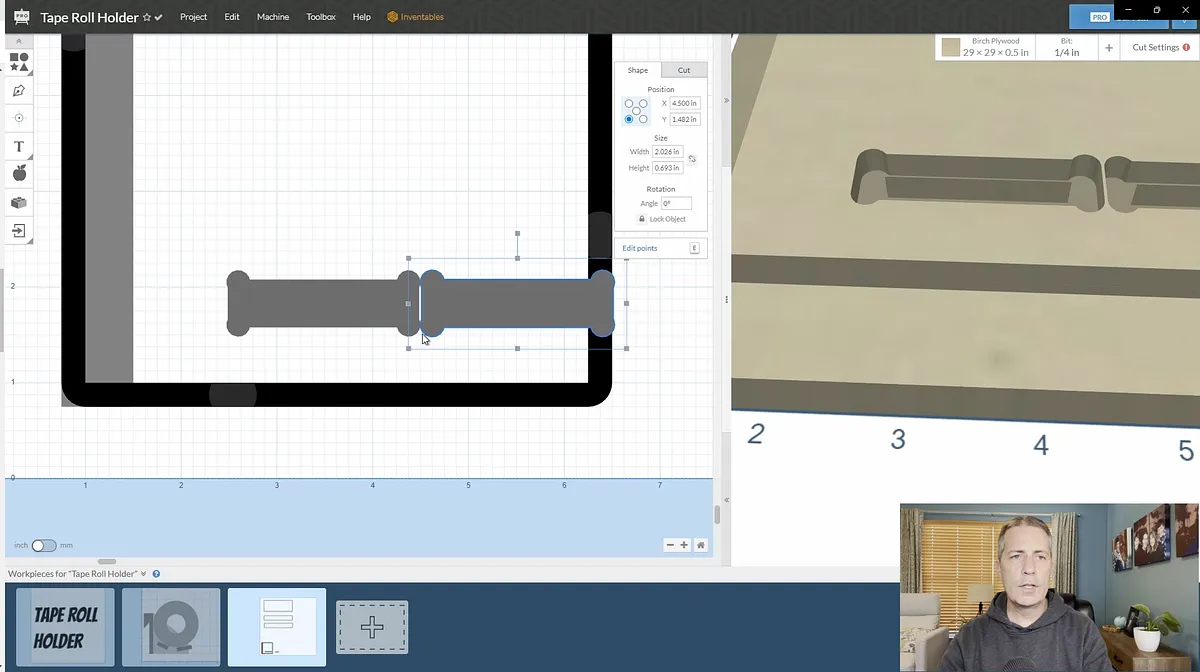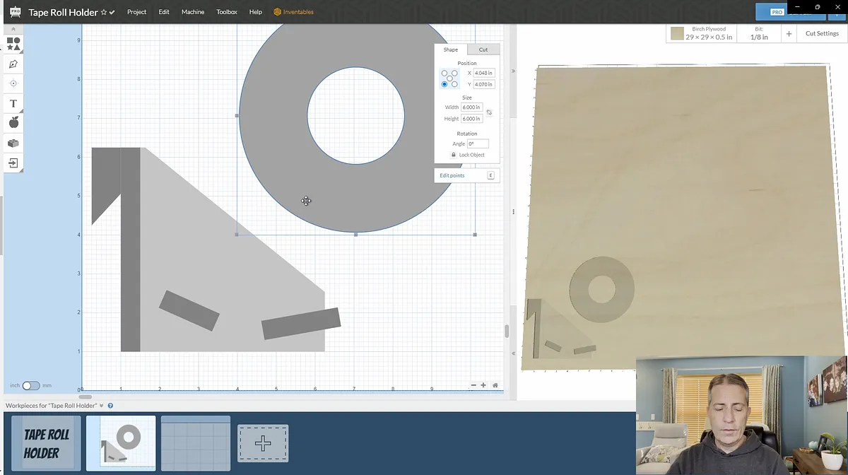 I started out the design of by creating a side view of the shelves in Easel. First I drew a circle the size of the largest roll of tape I had on hand. Then I created the two sloped shelf pieces using the rectangle tool.