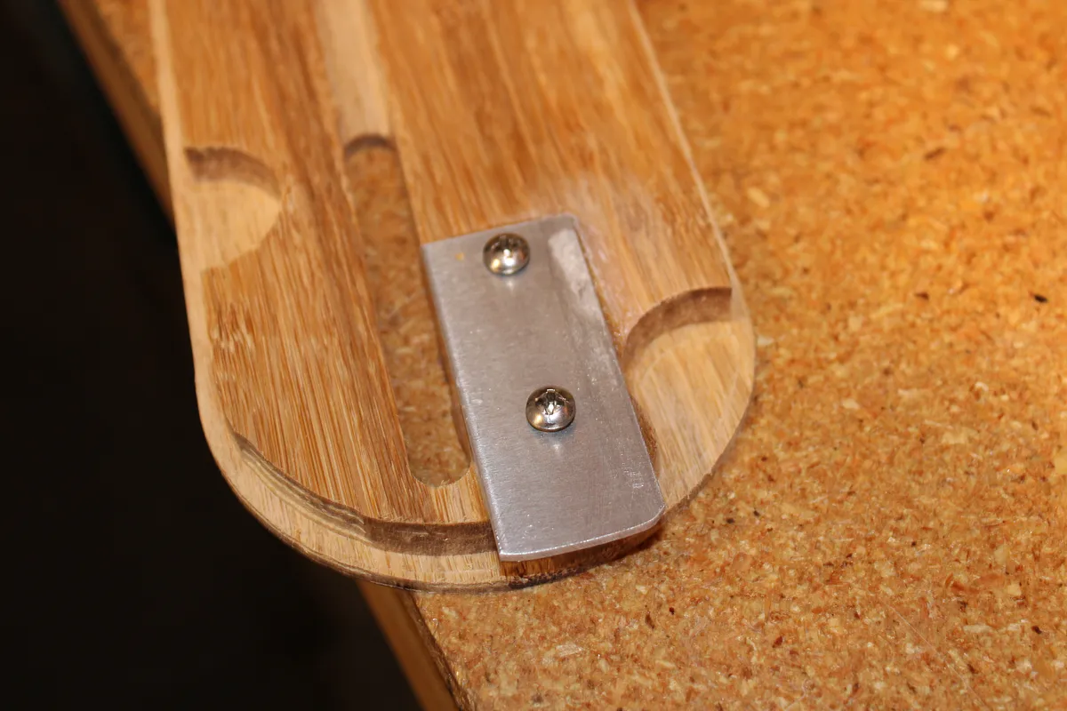 I cut a piece of scrap aluminum (you can use any metal you have) for the tongue. Again I used CA glue to hold it then added two screws. No need to counter sink here there is plenty of room. Then I used my sander to round the corners.