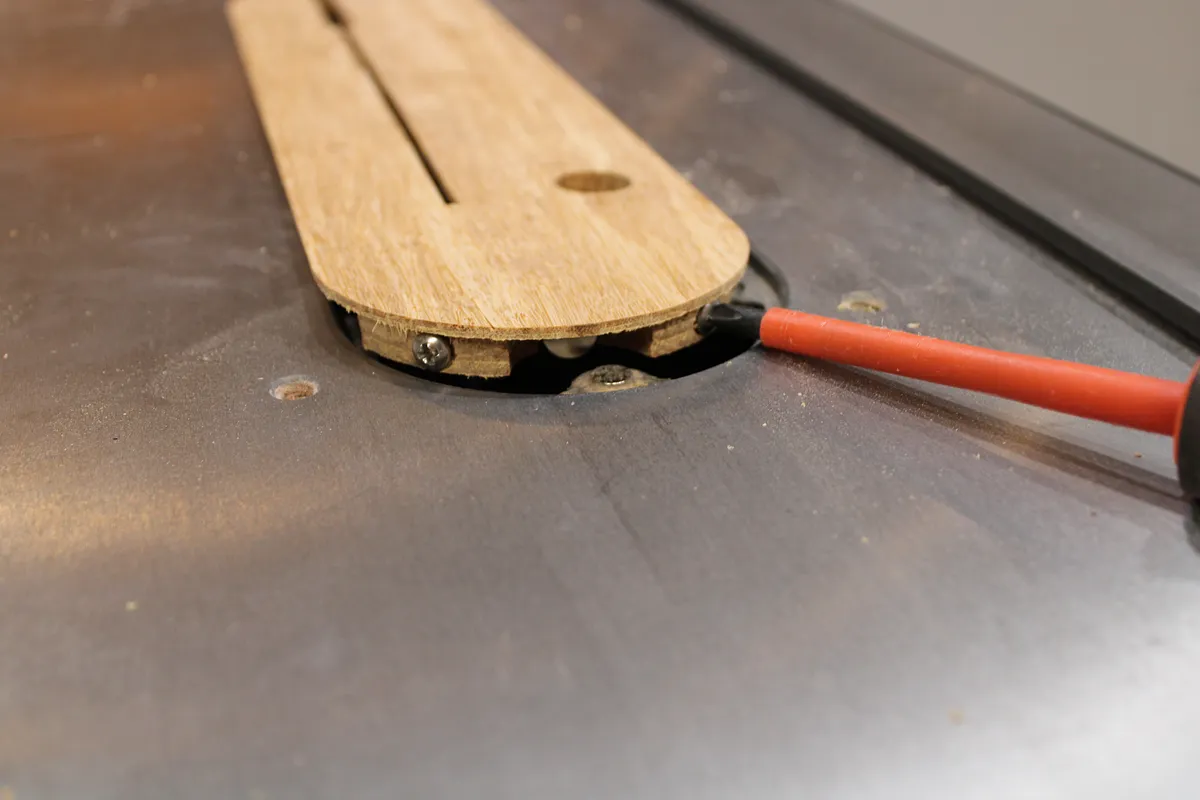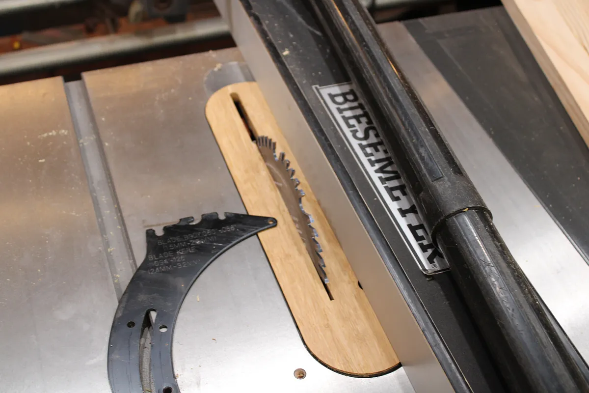 Once I had a tight fit I removed my riving knife to make the blade cut. Then I re-installed the insert, moved over my fence. Then turned on my saw slowly cranking the blade up. The blade slowly rises and cuts its kerf in the insert. If you are not comfortable holding down the plate use a scrap piece of wood. Keep your hands clear of course.