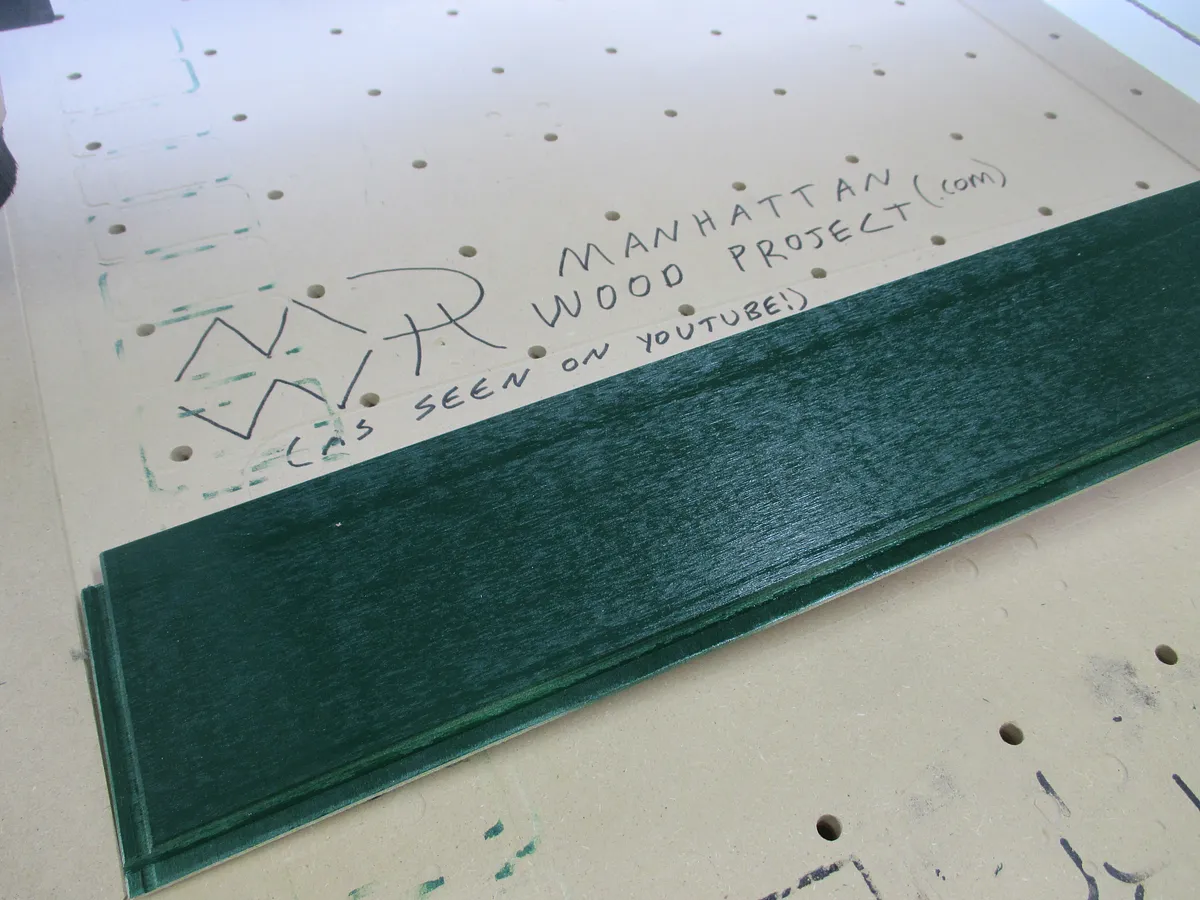 Be sure to let the paint fully dry for at least a day before setting it on the wasteboard and cutting. Failure to wait could result in a little bit of paint transfer to your wasteboard (and the subsequent dust sticking to the painted pieces). Uncured paint can also gum up your bit and mark up the sides of the pieces, which requires a lot of sanding to get rid of.