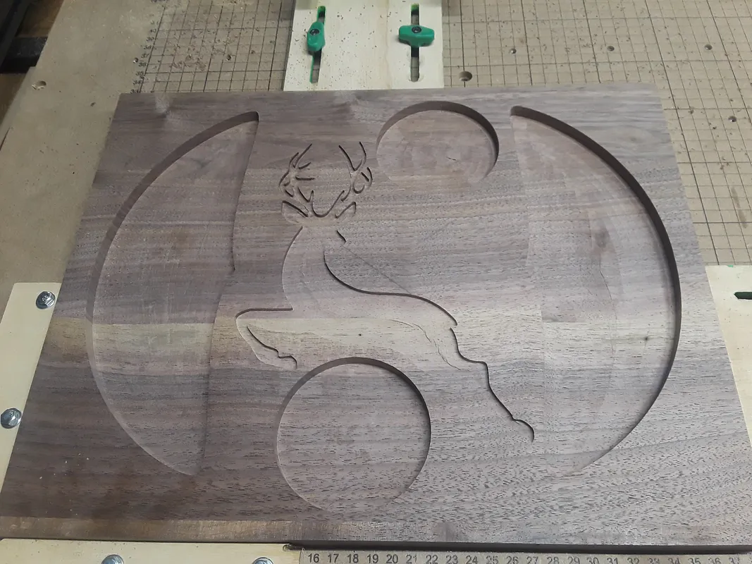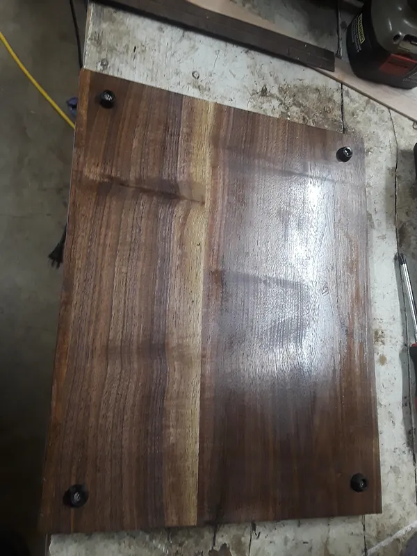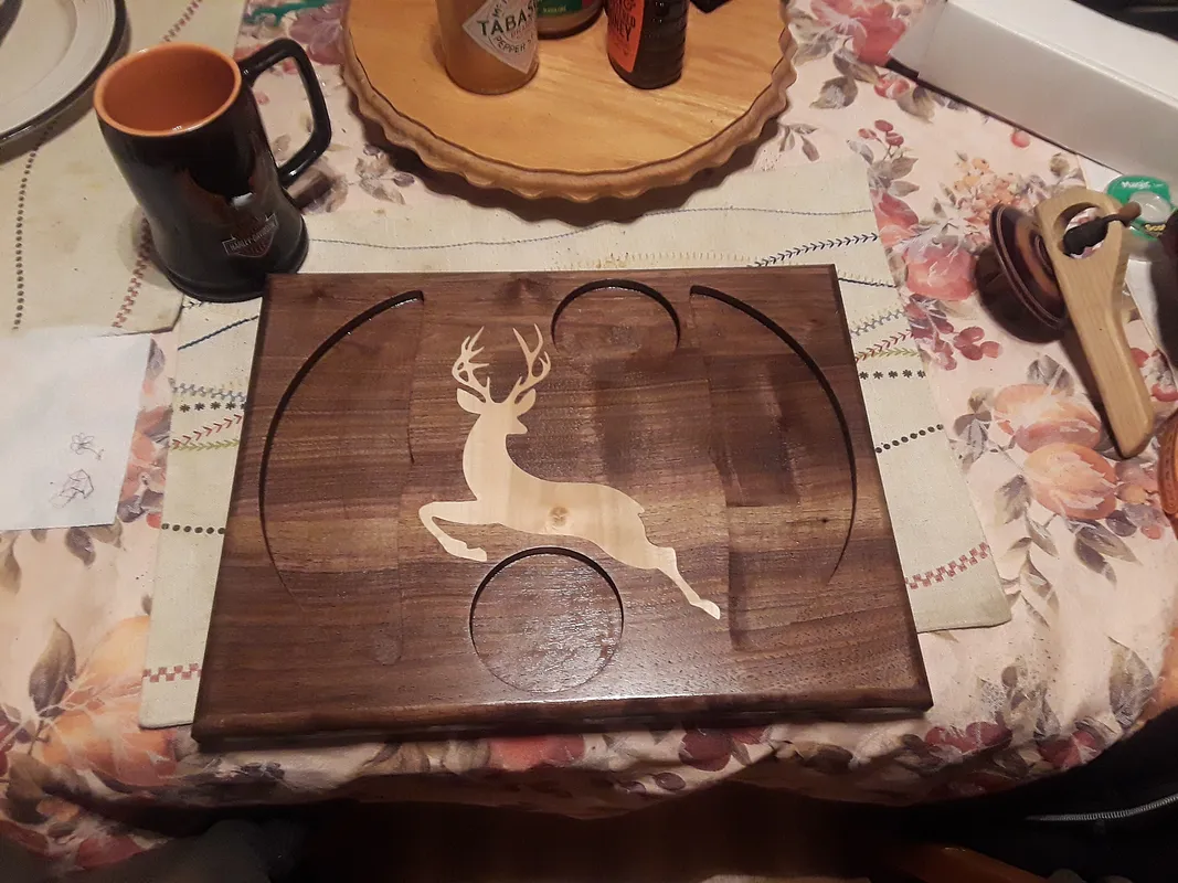 Black walnut board with Silver maple inlay. Side pockets for crackers or cheeses and round pockets for cheese balls. Sealed is mineral oil and polished with bee's wax. Can also serve as a lite cutting board for sausage