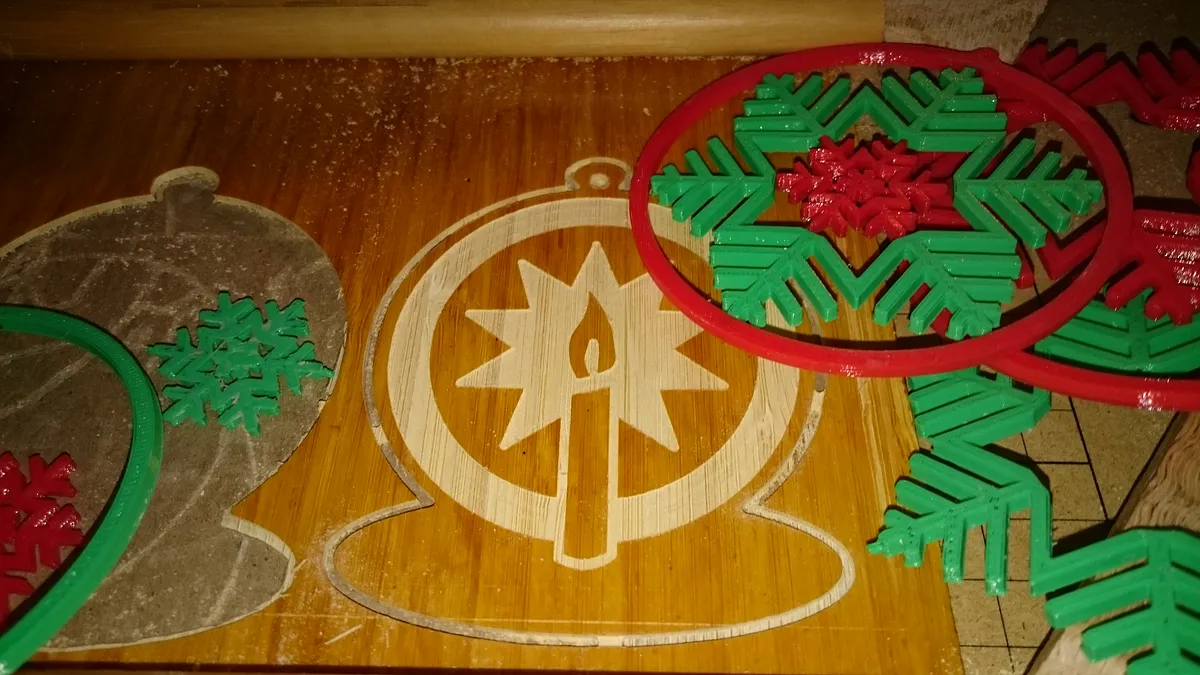 Inspired by an old piece of clipart from Dover's Christmas Vector Motif collection, this is designed to be etched into a piece of shellacked veneer. I used bamboo.