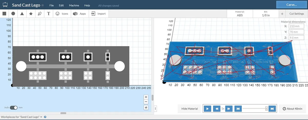 Now that I had the dimensions, it was time to create them in Easel so that they the mold could be cut out. I designed these so that this one mold could be used for both sides of the casting. This will result in two of each size piece when done cutting both sides.