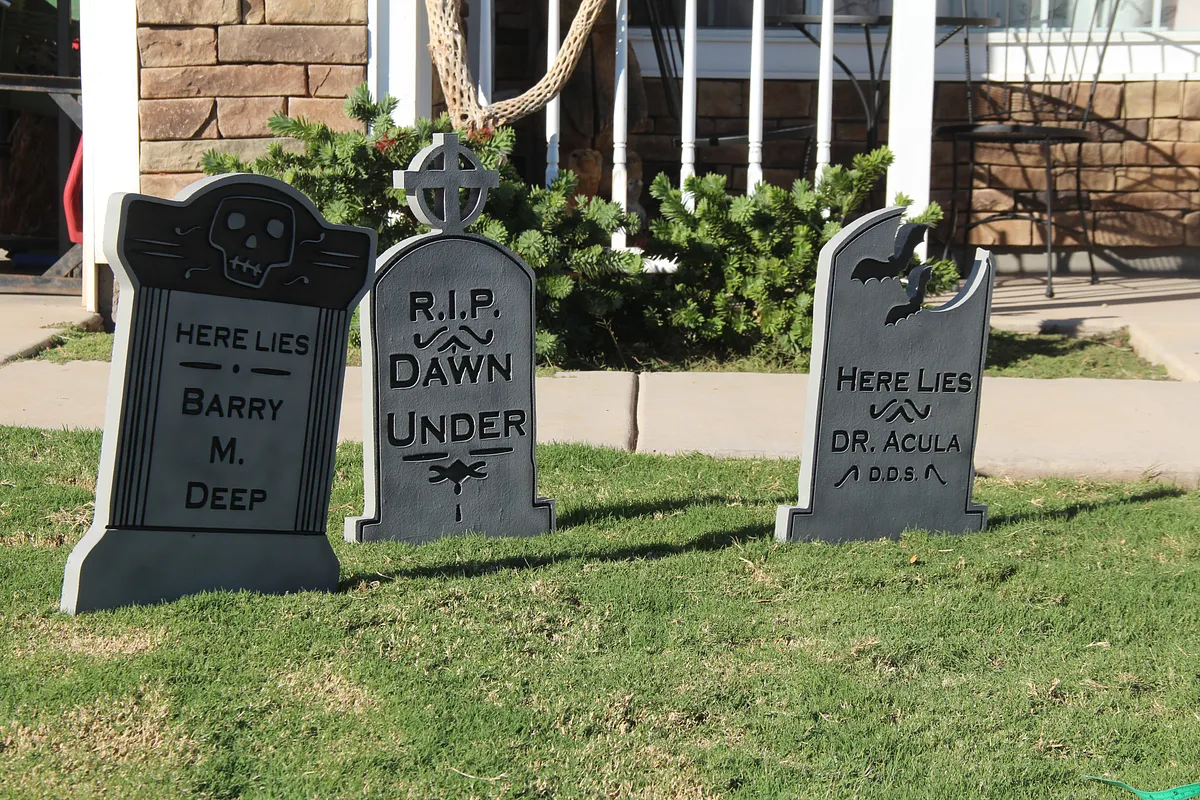 Depending on where these will be going, you might have to come up with different solutions for installation. Mine ended up in the grass so I just cannibalized a couple wire hangers, straighten them out and cut them into roughly seven-inch pieces. ofThen sticking them half in the ground and stabbing the tombstone on top the other half worked great. If you live in an area that gets high wind then you may want to use larger pieces.