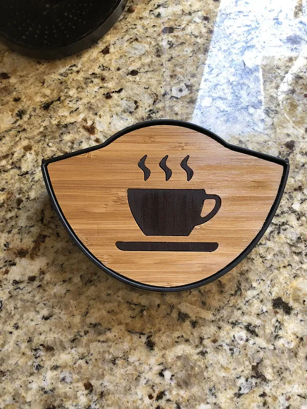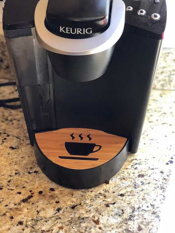 A custom bamboo and walnut tray for my Keurig coffee machine.