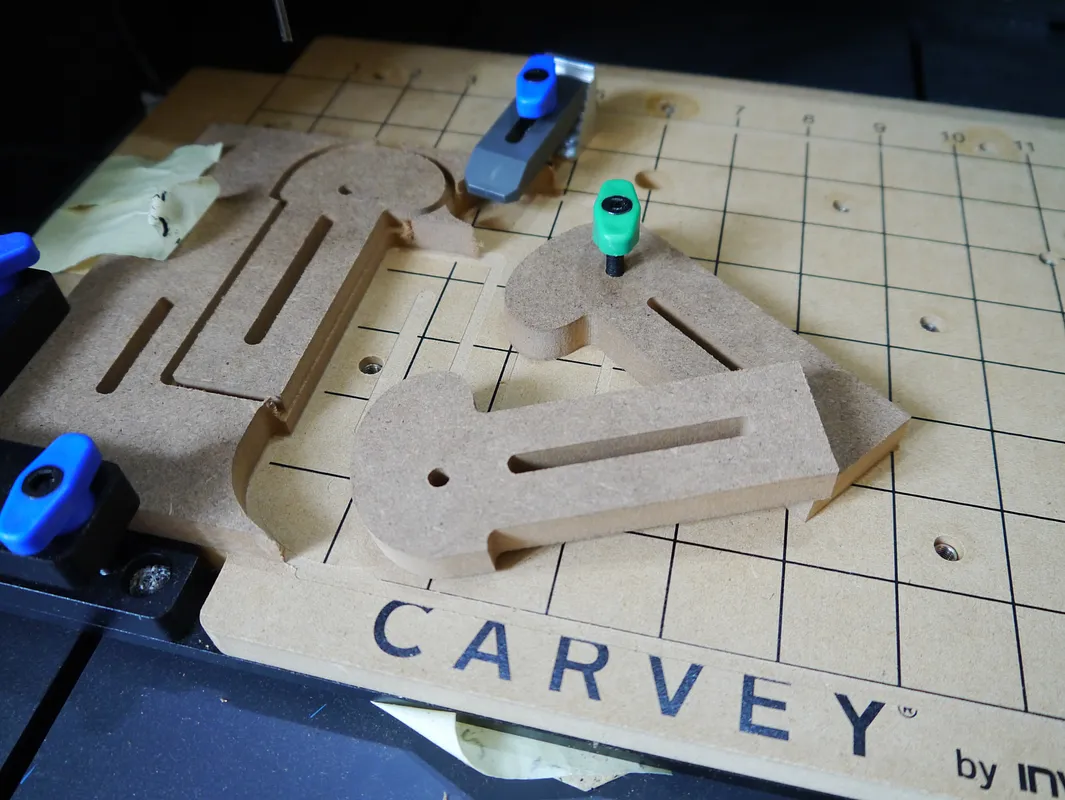 Insipired by Cam Clamp Down Combo from Jeremy Richards (https://www.inventables.com/projects/cam-clamp-down-combo) but smaller to be used with Carvey. It's packed full for the least possible amount of waste. All clamps are different in order to cover as many use cases as possible