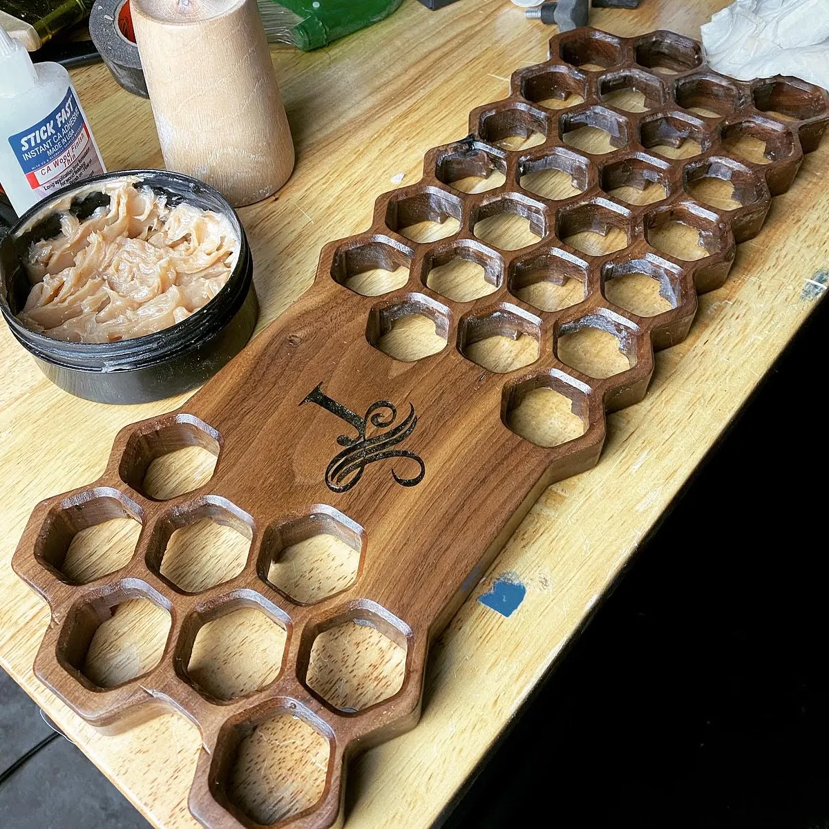 Then I sanded the whole thing to 220 grit. This is also the point I took the trivet to my laser and added the monogram. This could have been done on the X-Carve with a V-bit if I turned the piece over, but I wanted to play with my toys.