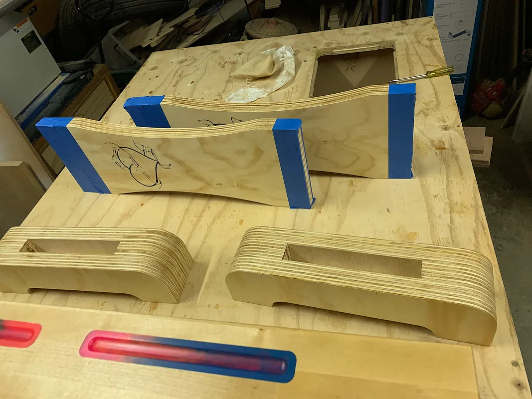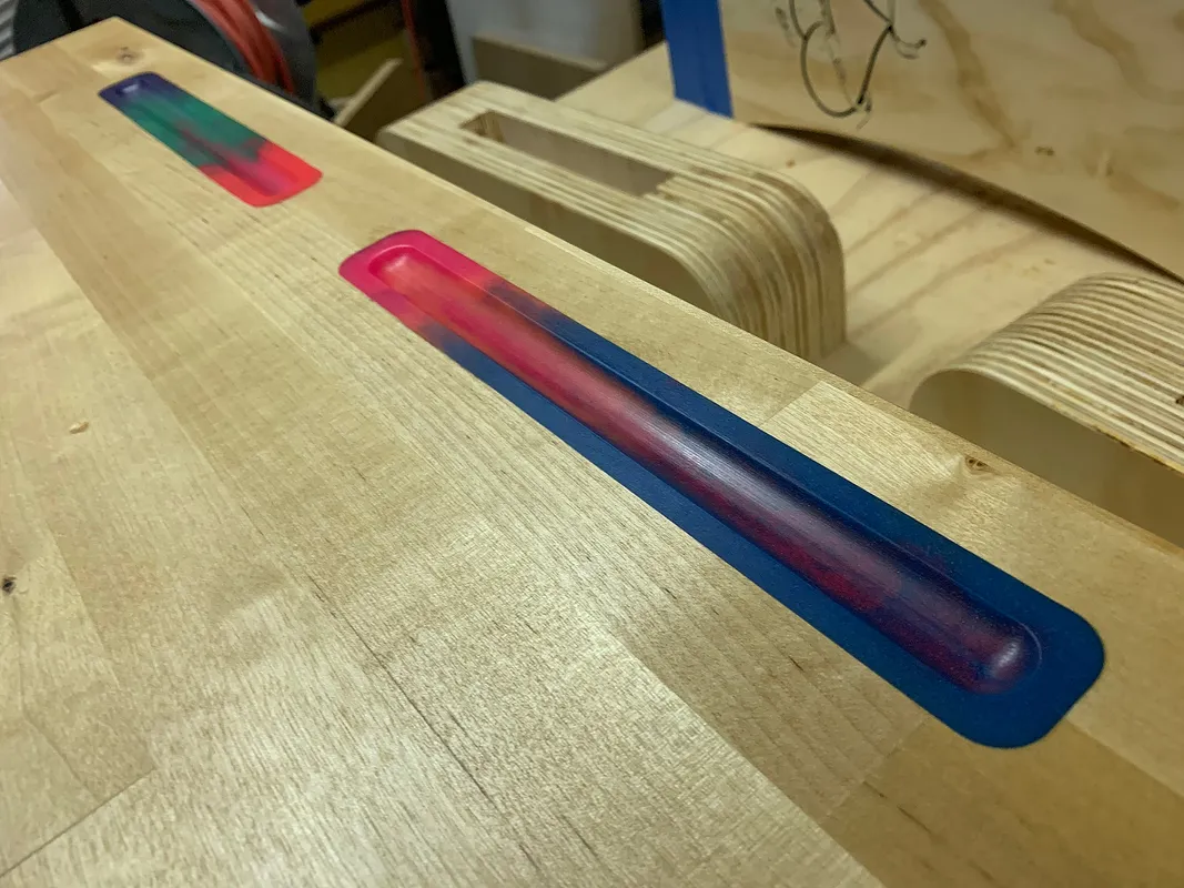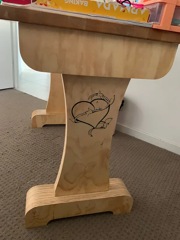 A project to build a kids desk. Used CNC to create legs, Legs are designed so the uprights are not fixed allowing new uprights to be cut as they get taller. Also added glow in the dark pen track.
