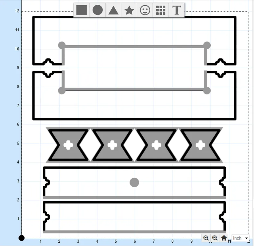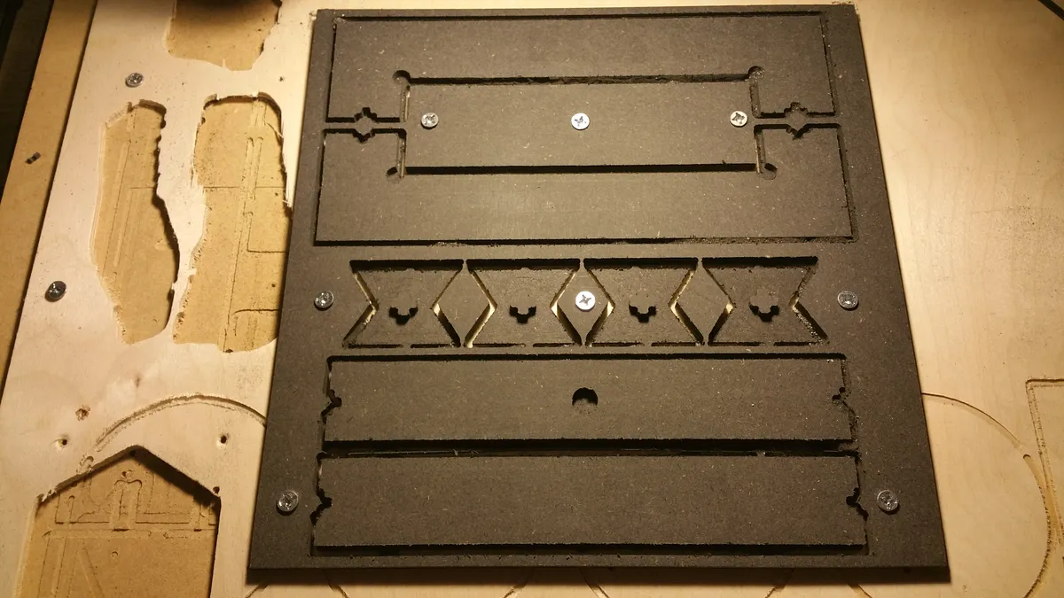 Now that the frame is designed, the rest is pretty easy! I tend to screw my pieces down to the waste board rather than clamping them, so that's what I did here. What I'll typically do is once my piece is designed, I'll make a copy of it and add a few holes just slightly larger than my bit (in this case, 1/8"), and then remove the rest of the project, so that it will just cut my screw-down holes. Once those have been cut, I'll screw the piece down, and then run the original project.