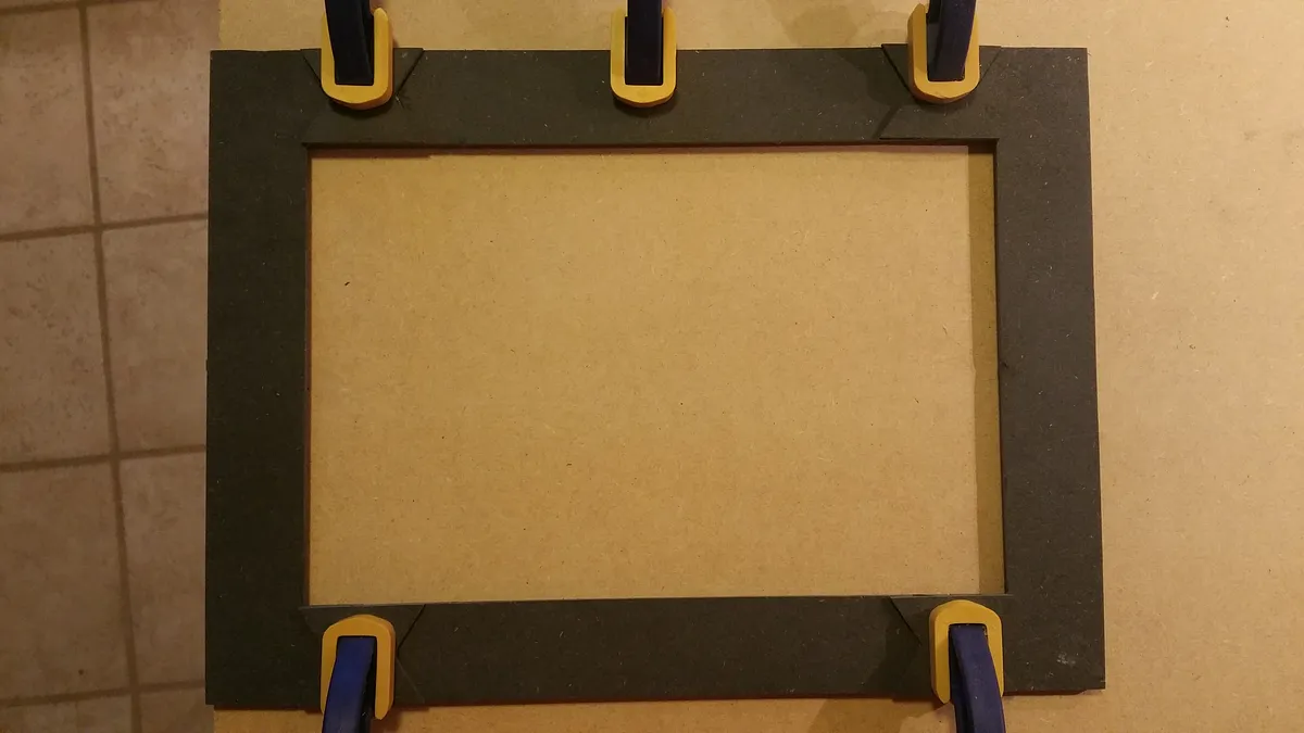 To glue it all together, I placed the pieces (face-up) on a piece of scrap MDF, and used a square to make sure that they were all lined up. Once I had them squared up, I clamped them into place, put a small amount of glue on the back of the decorative pieces, and pressed them into place. Once I was happy with how everything was fitting together, I added some additional clamps and let it dry overnight.