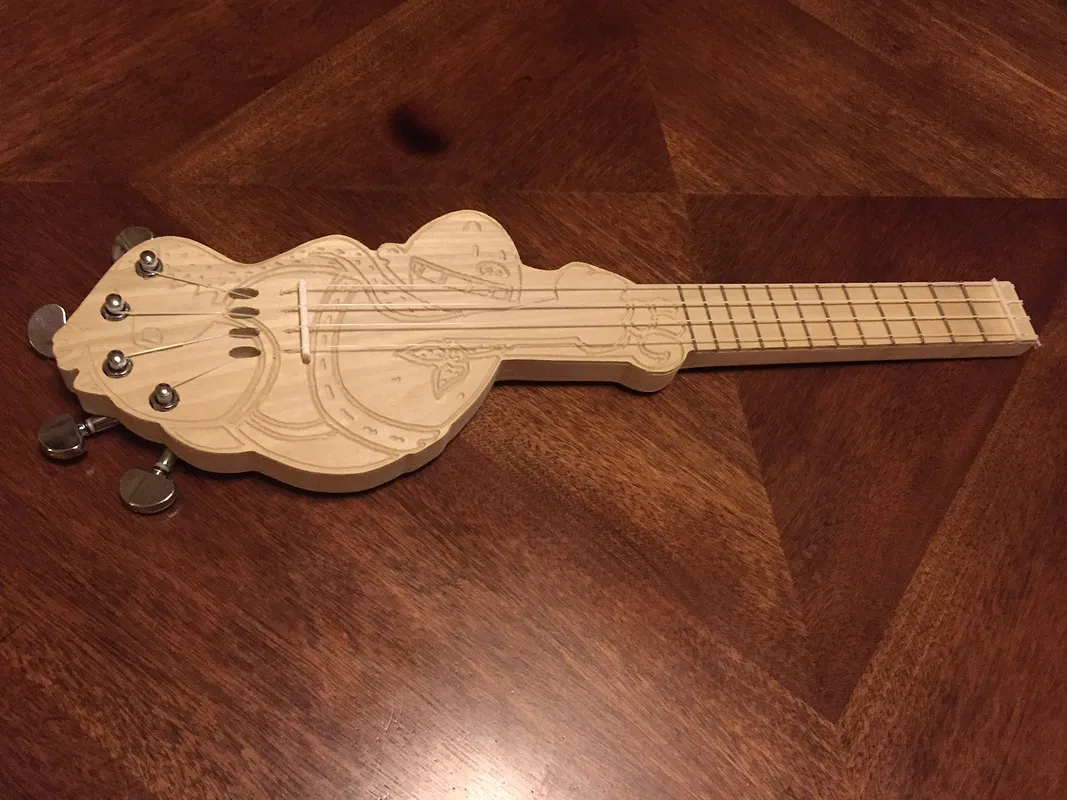 Using a 1/8" bit, I then cut the holes for the tuners to go through (as well as the pocket for the strings to be pulled down just past the bridge), the slots for the bridge and nut to rest in, and the outline of the instrument.