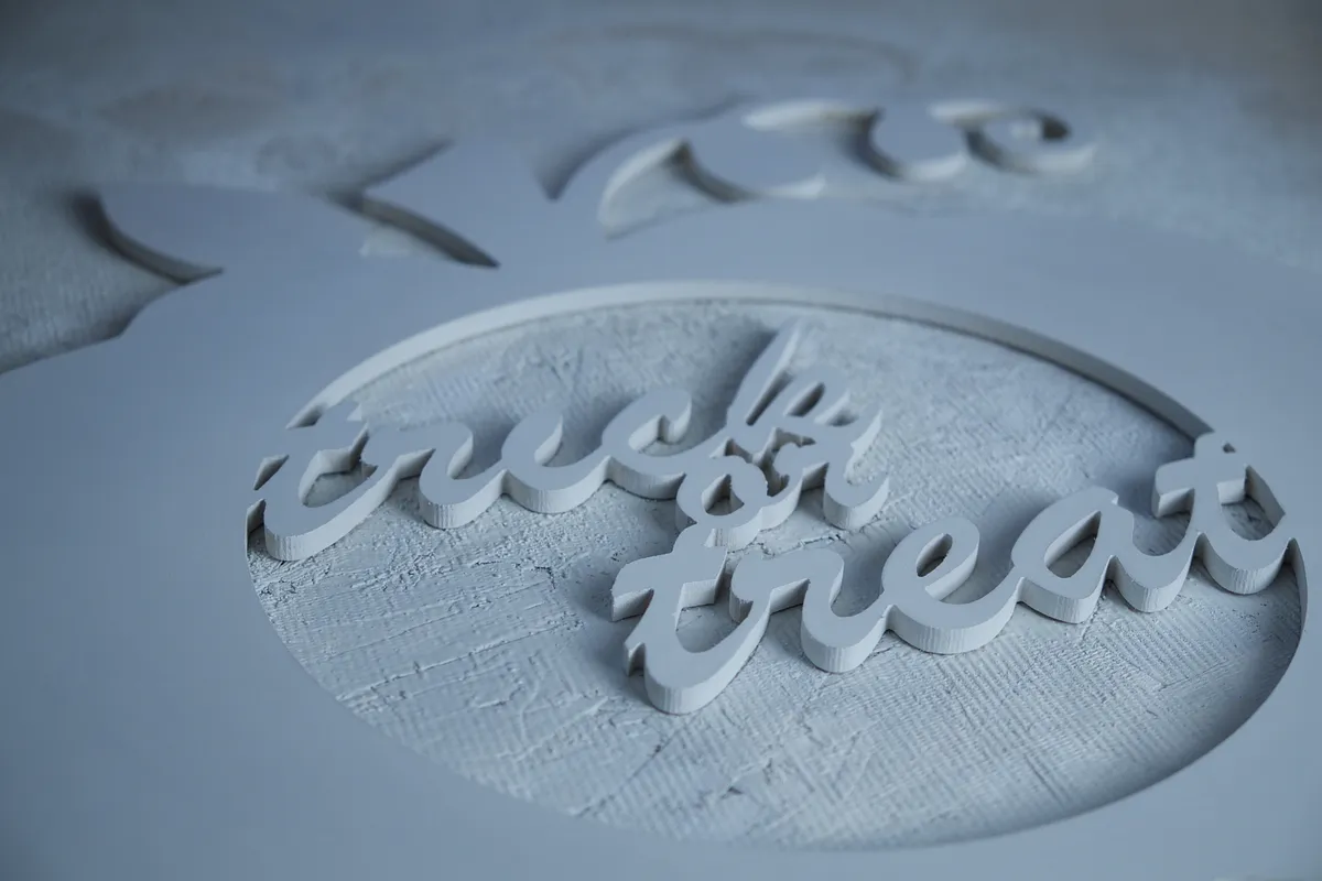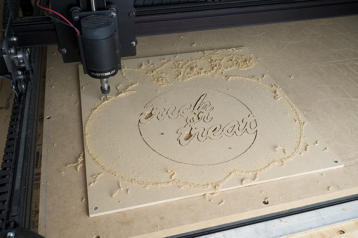 "Trick or treat" was cut using a 1/16" upcut end mill and the "Pumpkin" cut using an 1/8" single flute upcut endmill. The parameters were as follows: