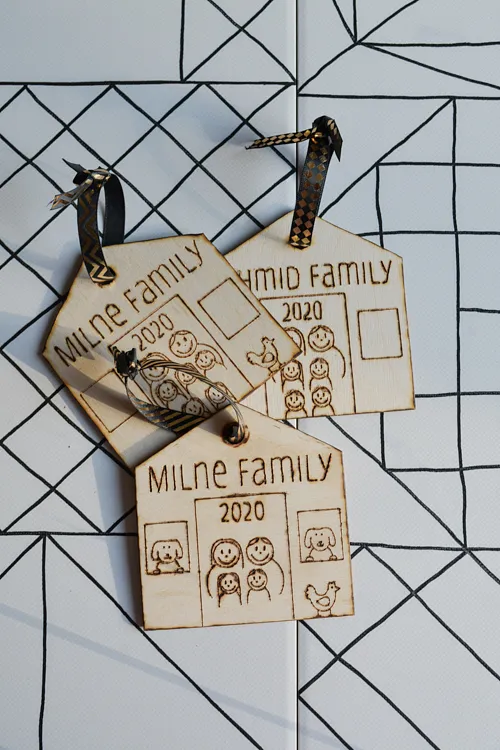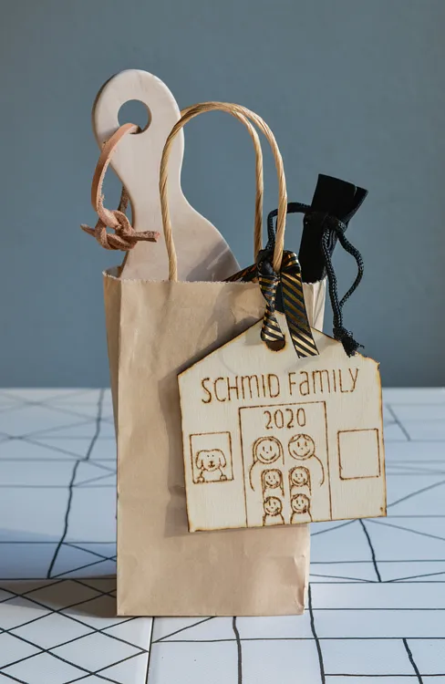 In order to give them that homemade look I was going for I went through and burned them all with a woodburning pen afterward. You can, of course, design them in whatever way you like. I finished them off with ribbon and attached them to gift bags because it turns out that, bonus, they make great tags, too!