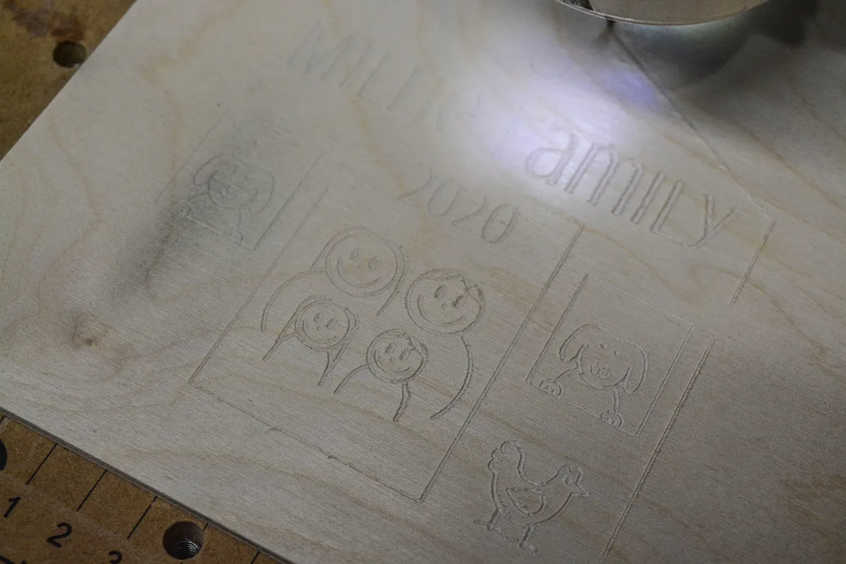 The file is set to carve on a thin sheet of 12x12 plywood, though that can be changed to whatever you like, of course. I found that the best bit for this is an engraving bit. The tip is small enough to etch the detail needed to go this small, but sturdy enough not to break.