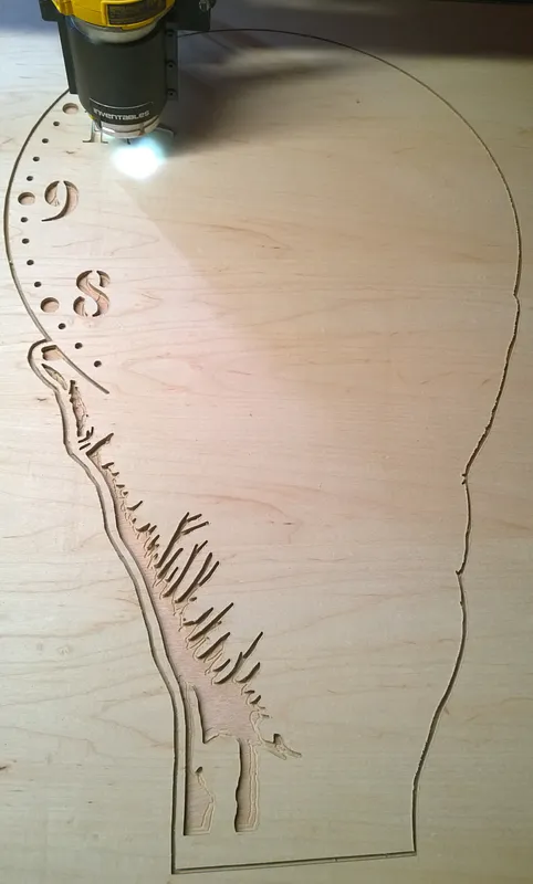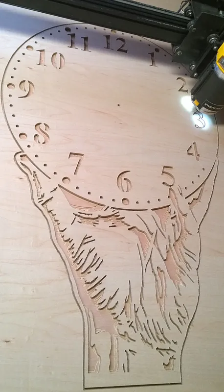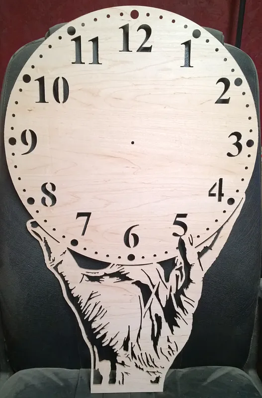 1- Choose your material of choice. I chose Maple ply with mdf core. 2- Put the thickness, width and length into Easel. For me it was 3/16 thick and 29 1/2 × 18 3/4. 3- Choose your depth per pass. I am using a DeWalt 611. My bit was 1/16 2 flute fish tail. Depth per pass set at 0.028 in. 4- Set the feed rate. I went with 28 in/min. 5- Make sure the bit in your desired home position and make the bit “kiss” the surface. 6- Go through the portion of the Easel carve setup to confirm all steps you’ve completed. 7- Hit Carve and go! 8- When completed, sand and finish to your liking. 9- Add your desired clock movement. Enjoy!
