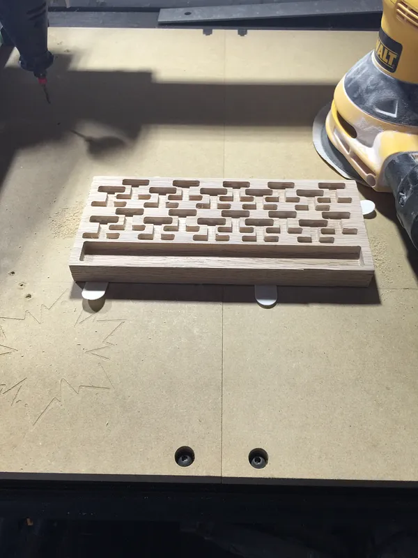 I cut this out of 3/4" oak 1x4's. It's 8" in length and 3.75" wide. I had originally planned this for the drawer of my dresser but it turned out nice enough that I'll probably just keep it on the top.