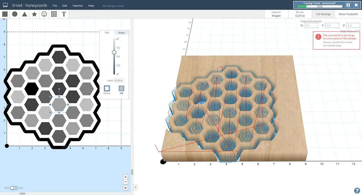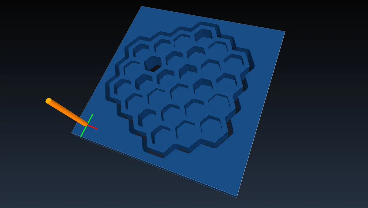Load SVG with pattern and assign random depths to the hexagons within the honeycomb patter. Create a profile "outside" operation for the outline.