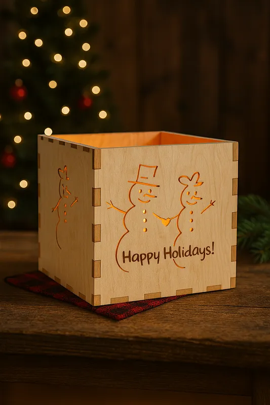Mr and Mrs Snowman dance around a lantern. Makes a fun candleholder or a festive box for holiday treats!