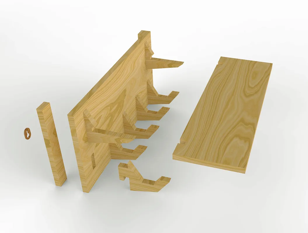 Check if all parts are well carved and sanded before assembly. You should have a board with 7 carved rectangles, a shelf, 5 "C" hooks, 2 "L"hooks, 2 frame profiles and 2 walnut structures for wall mounting. Glue together the walnut structures in the circular void in each frame, after that frames can be glued together in the back of the board. Let them dry. At this point it can be already installed on the wall with 2 ø5mm screws. After that, all of the hooks can be placed by pushing them into place and then forcing down gently to join everything together ("C" hooks go on the lower row and the "L" hooks go on the upper one). Assemble the shelf carefully in the upper "L" hooks. Done!