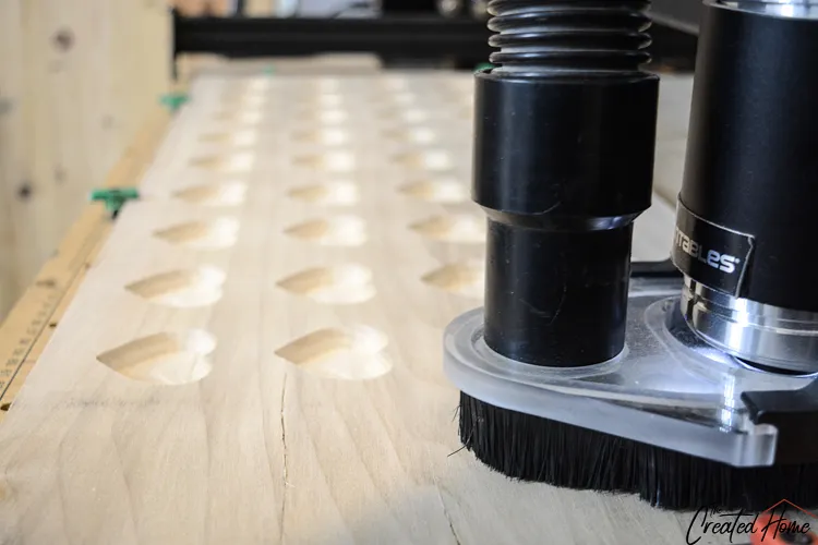 Switch to the Stage 2 cut on your Easel screen and replace the bit with a 1/8" straight bit. It is essential that you do not move the machine out of its home position. It will need to start in the same spot in order to cut the hearts out. The hearts will be held in place with two tabs which you will have to cut later.
