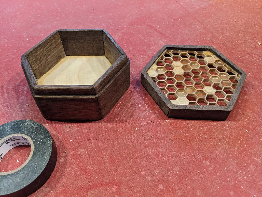 Simple hexagon box design. Use epoxy to fill random hexes for a neat effect.
