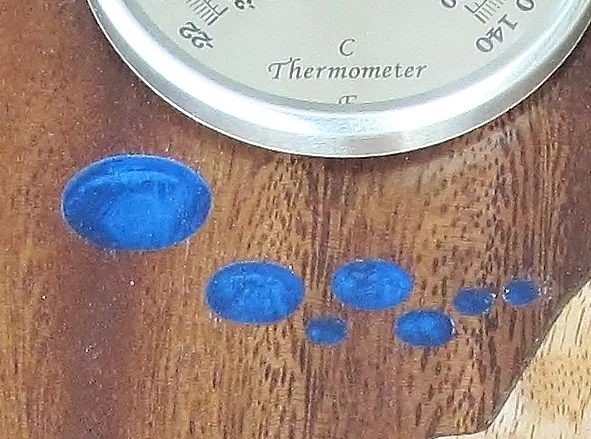 The bubble pockets are first painted a bright silver paint, then filled with a blue tinted resin. Everything is then sanded down flush and spray finished with 3 coats of clear lacquer and temp gauge is press fit.