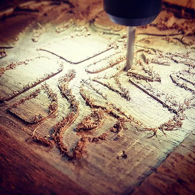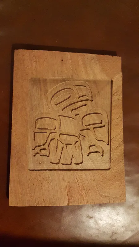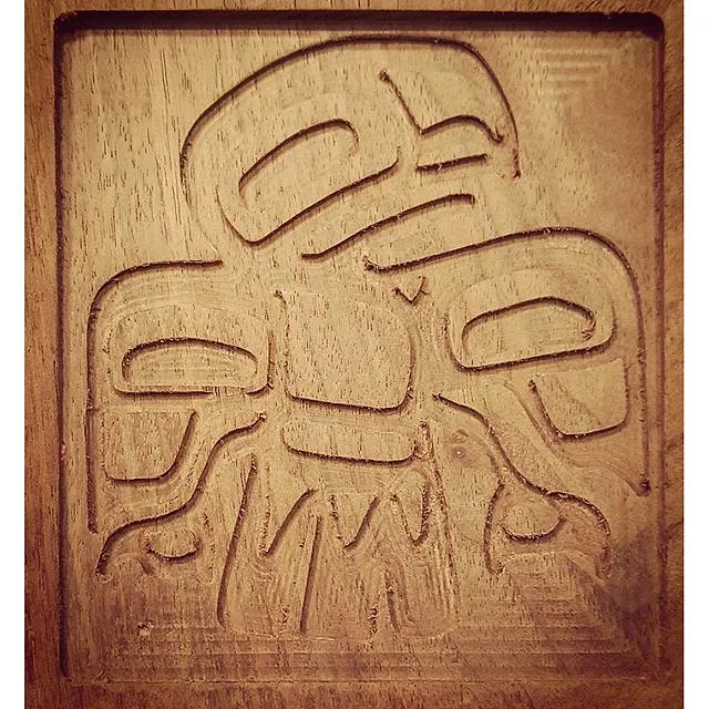 Using an odd shape of reclaimed wood a milled pocket to surface the material and then an inset Pacific Northwestern eagle is set.
