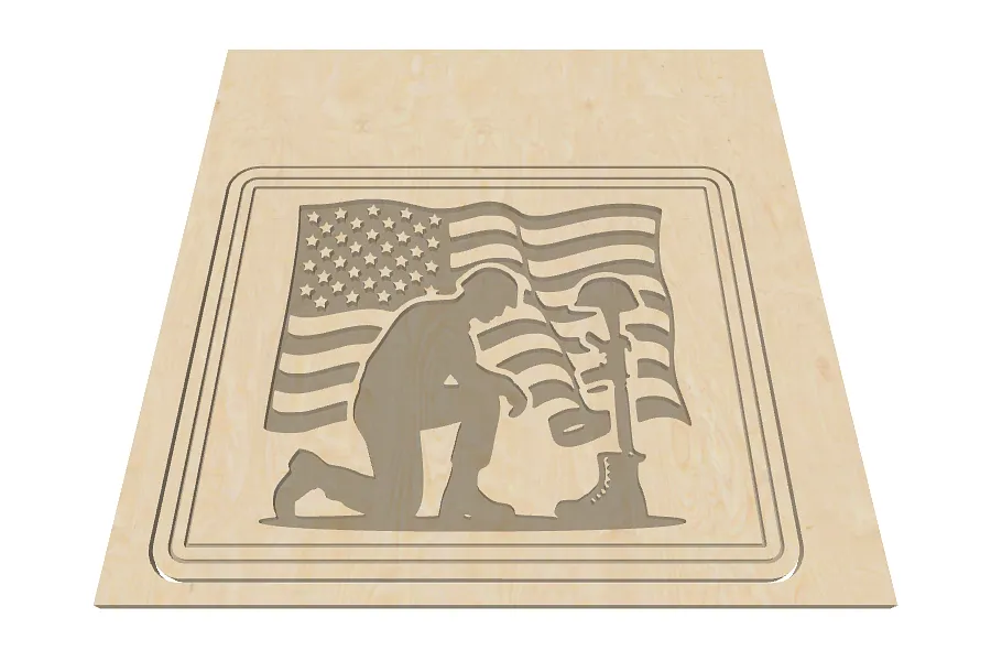 The fallen soldier silhouette stands before a wavy American flag. The design honors sacrifice, service, and patriotism, into a powerful symbol of remembrance.