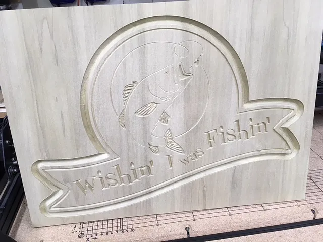 Carve, I used a 60 degree bit to carve the fish to preserve the details of the design and then changed to a 90 degree v bit to carve the remaining.