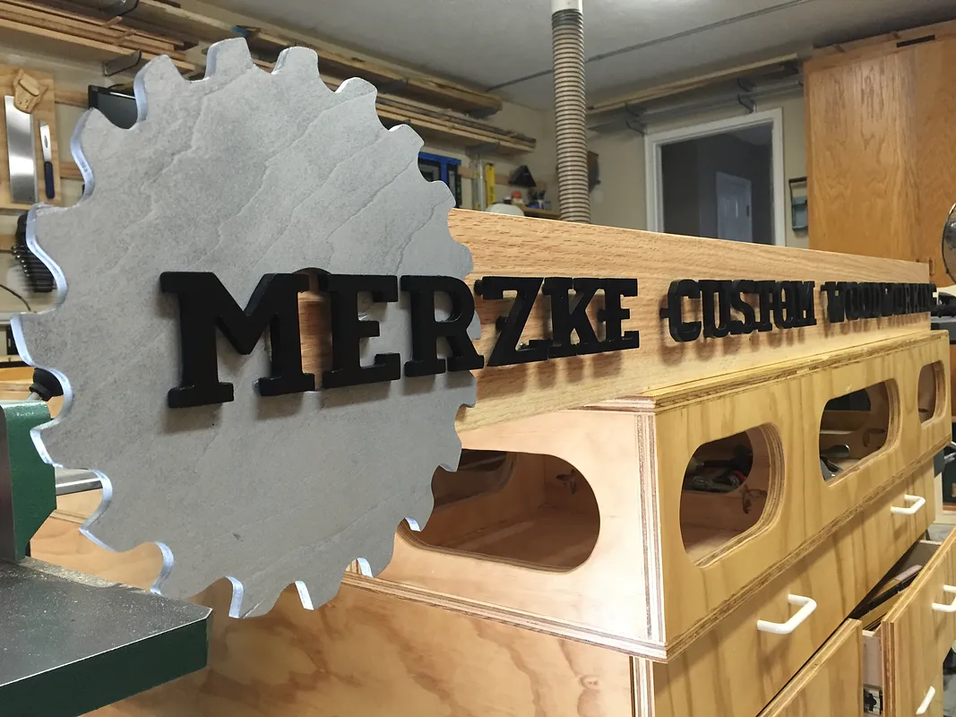 My shop sign that I made had my business name on it "MERZKE CUSTOM WOODWORKING" and I used Easel to design and then cut out the letters on my X-Carve. I once again used 1/4 inch plywood for this step. I cut down the sheet of plywood into smaller panels that would fit within the cutting area of my X-Carve and then arranged the letters in Easel to maximize the use of the plywood and minimize waste. Once the letters were all cut out I sanded them and then spray painted them black.