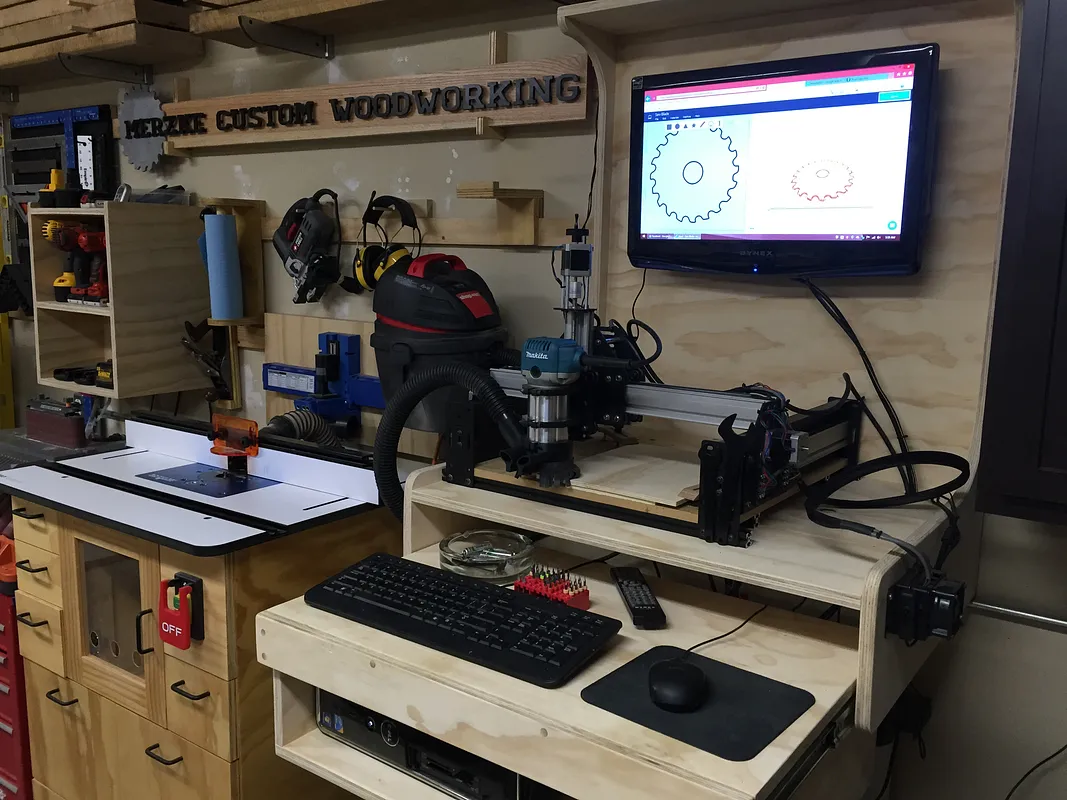 Since my logo has a circular saw blade similar to whats found in table saws and many other power tools, I found a image online to my liking and imported the file into Easel. I then cut out the saw blade out of 1/4 inch plywood on my X-Carve. Once the saw blade was cut out I sanded it and then painted it with silver spray paint.