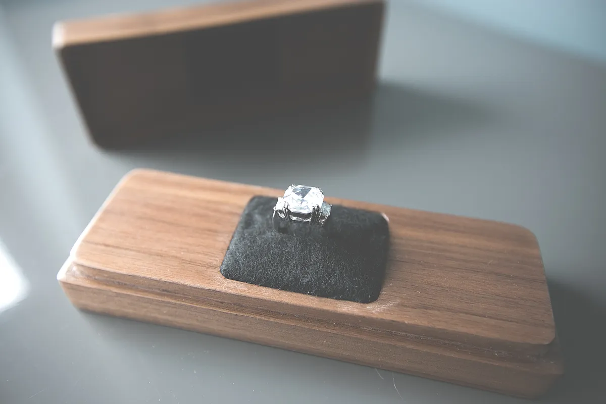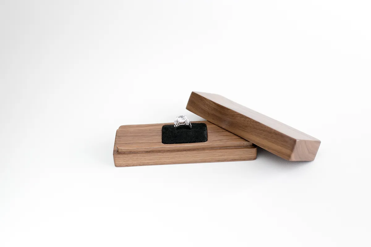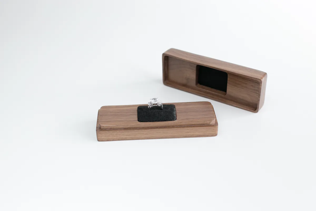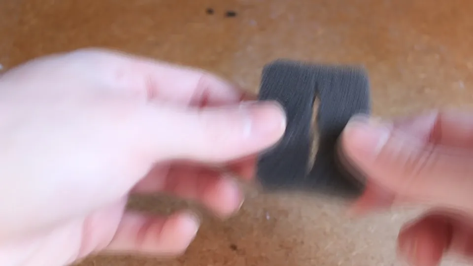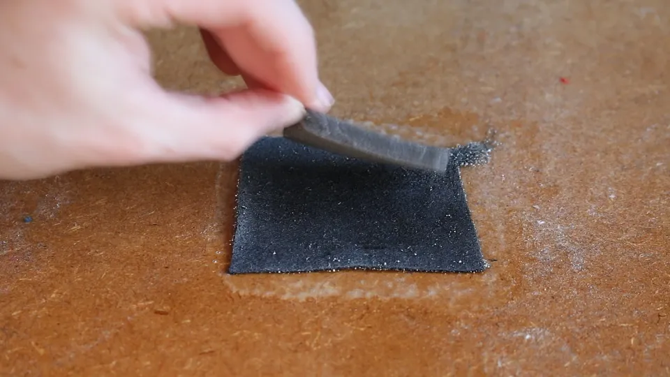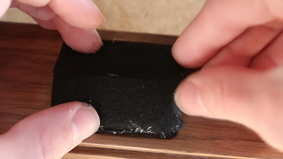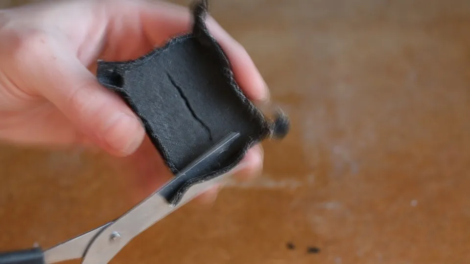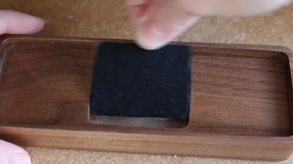 Because the base will be in contact with the ring I wanted to add foam. I cut a piece of foam slightly smaller than the opening in the base and also cut a slit in the centre, this will allow the ring to be pushed through and held in place. I could then use the spray adhesive to glue on some black felt baize. I folded it over the edges of the foam and trimmed off the excess with some scissors.
