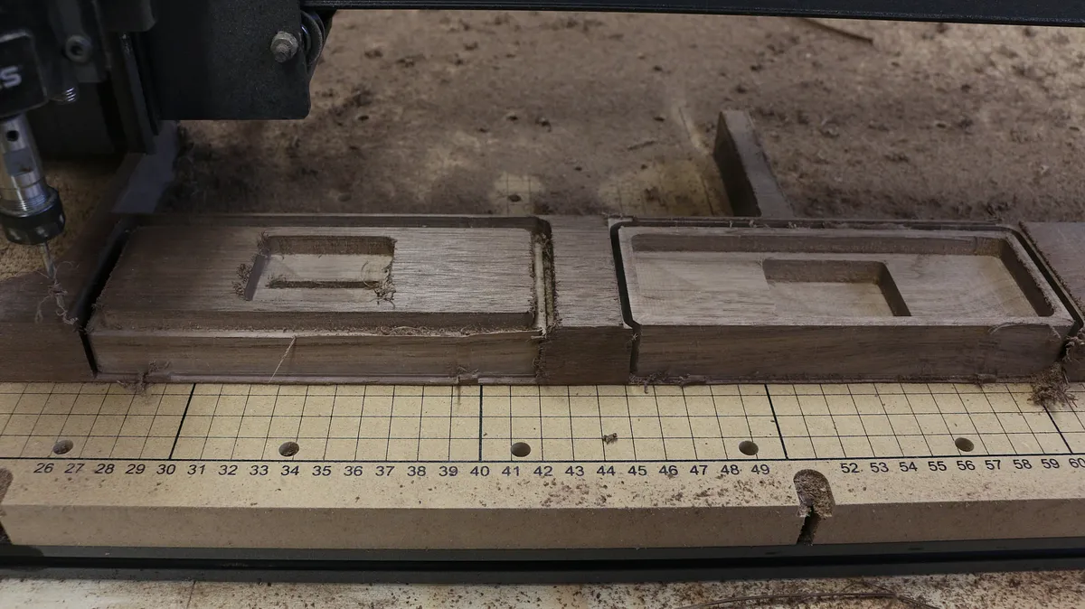 I started by securing a piece of walnut to my X-Carve using a couple of screws. The piece I was using was from a previous project, the section I used was about 350mm x 75mm x 25mm. This was enough for both the lid and the base the to the box.