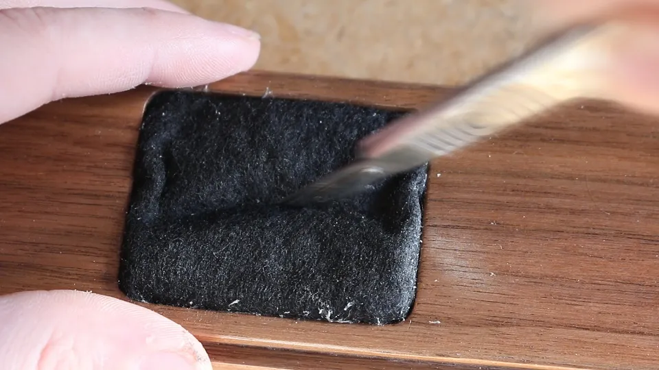 I then sprayed more of the adhesive on the back of the foam and secured it into the opening of the base. I made sure to tuck the edges down the side. I then used a sharp knife the cut the slit through the black felt baize, this will allow the ring to be pushed through and held in place.