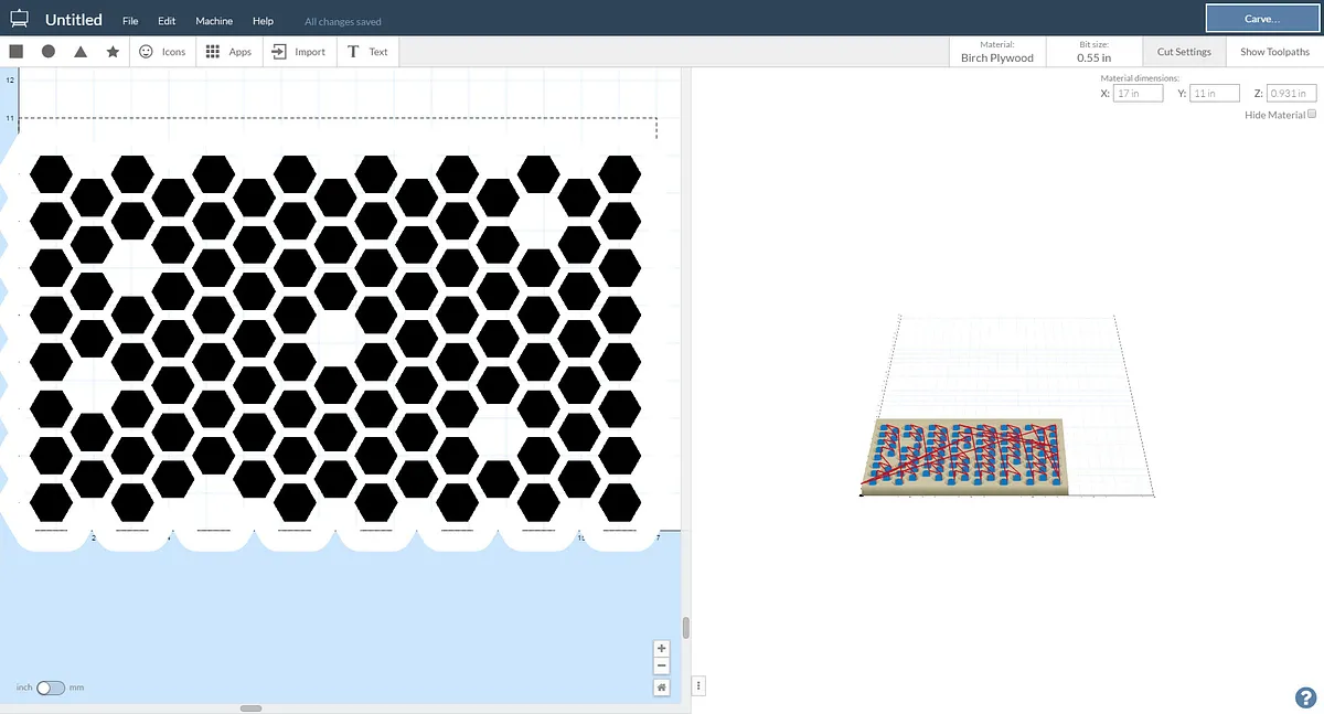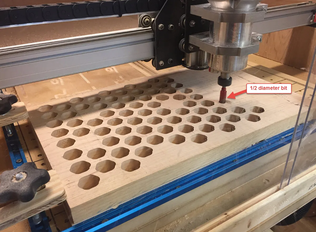 Since I want some stock left for final milling, I will cheat by setting the bit size to 0.550" instead of the real bit diameter of 0.500". This will leave about 0.025" stock on each hexagon.