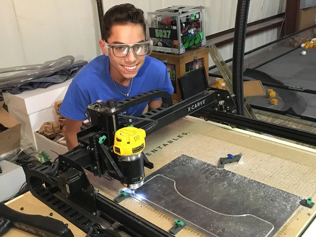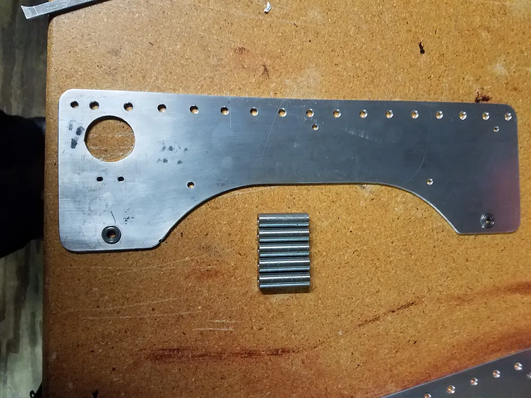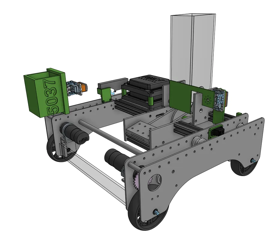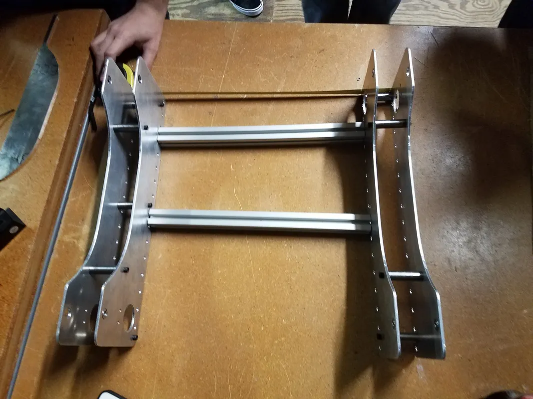 We cut 4 - 1/8 inch aluminum plates to form the drive train and chassis platform. Andy Mark Churros are used as standoffs between each drive plate and the two halves are connected with 8020 1010 extrusion